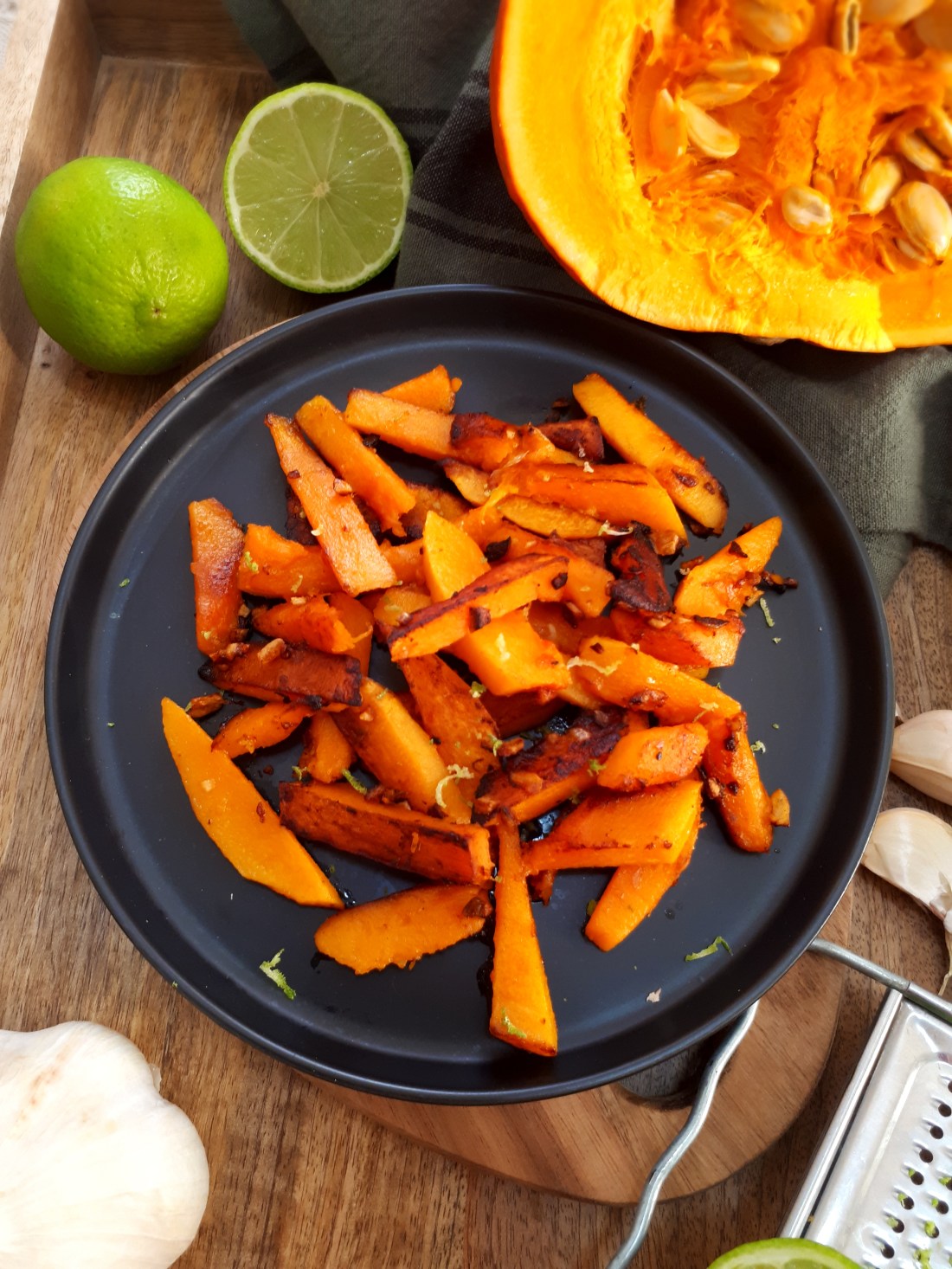 Dans une poêle, mets un peu d’huile d’olive, et l’ail coupé finement, ajoute les morceaux de courge (en forme de frite), sale, poivre
