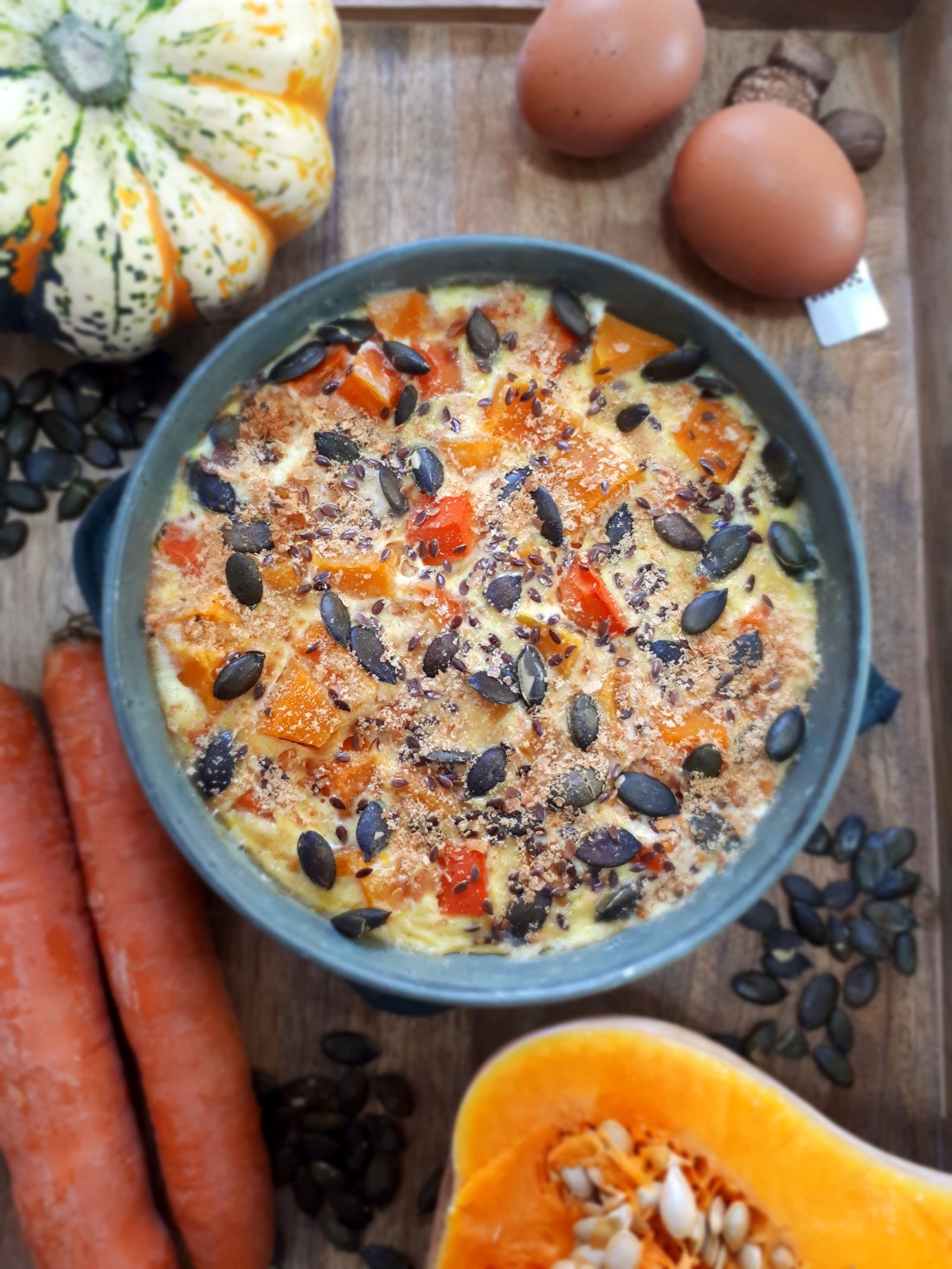 Prends un plat à gratin, mets y les morceaux de butternut, de carottes et verse le mélange. Rajoute les graines et 1 grosse cuillère à soupe de levure de bière.