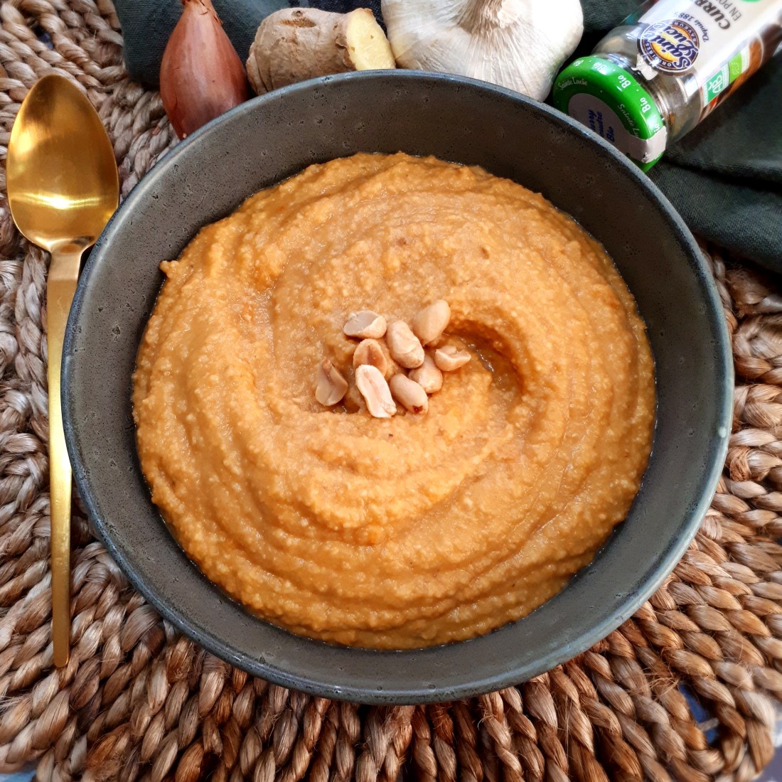 Mixe ensemble la purée de patate douce, les lentilles, le gingembre haché, le curry, ½ cuillerée à café de sel et le beurre de cacahuète.