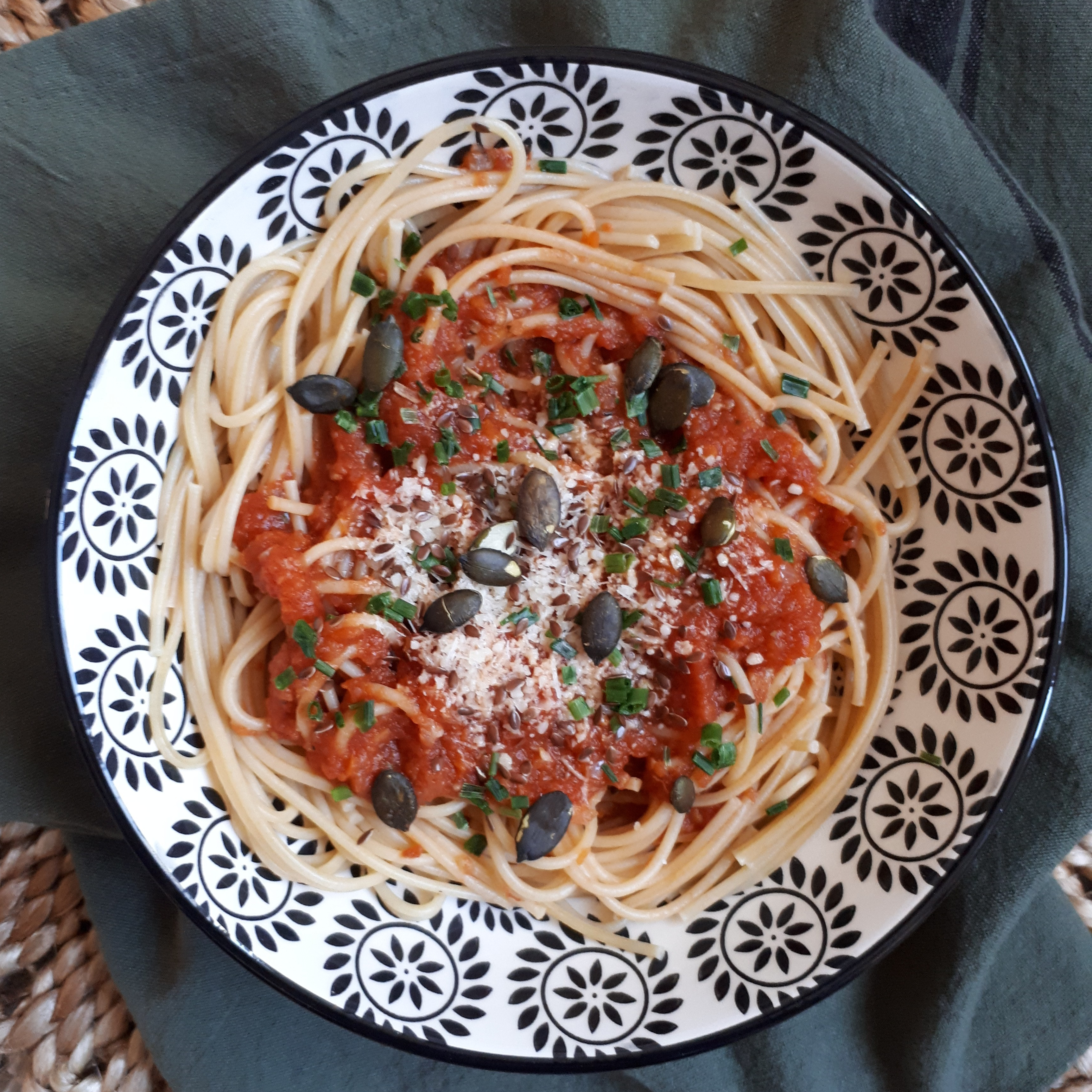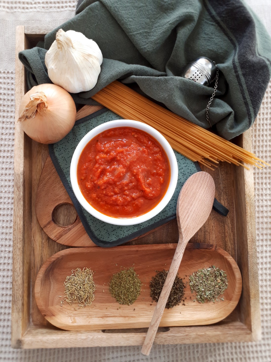 Prends une casserole de taille moyenne, mets-y l’huile d’olive et les gousses d’ail que tu auras préalablement coupées finement. Laisse revenir deux minutes à feux doux. Ajoute ensuite tes deux oignons coupés grossièrement. Fais revenir le tout 10 minutes environ (jusqu’à ce que les oignons soient fondant). Je te conseille de mélanger régulièrement pour éviter que cela brûle, pendant ce temps coupe ta carotte en petits morceaux. Ajoute la au reste, laisse revenir quelques minutes, ajoute un peu d’eau si ça accroche. Ajoute un peu de sel et de poivre. Prends, tes tomates, épluche les et coupe les, ajoute les au mélange. Si tu as pris une boîte de tomates pelées coupe les et garde aussi le coulis présent dans la boite, mets le tout dans la casserole. Maintenant, mets une petite quantité d’herbes aromatiques de ton choix dans la préparation. Ajoute une dizaine d’olives vertes coupées en gros morceaux. Dans une boule à thé, mets à nouveau les herbes de ton choix, et mets la dans la casserole. Etape la plus facile, laisse mijoter minimum 15 à 20 minutes, plus tu laisses mijoter plus les herbes donneront du goût à l’ensemble. Généralement, je laisse sur à feu doux pendant 45 minutes. Tu peux réajuster l’assaisonnement (sel+ poivre) en fonction de tes goûts.