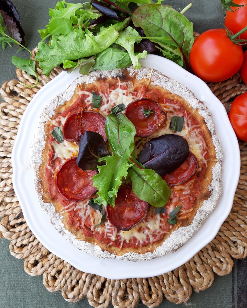 Je préchauffe mon four sur 180°. Pour la pâte, je prends de la farine d’épeautre, 120gr environ + 20gr pour le plan de travail, 100gr de yaourt blanc nature type Danone, un œuf, une poignée de multi-graines, sel, poivre. Je mélange le tout, pour faire une boule, puis j’étale ma pâte à la main. J’aime quand elle est un peu épaisse. Au moment de mettre la pâte à cuire, j’augmente le four sur 210°. Je la laisse 20 mins environ. Ensuite pour la garniture, j’ai mixé deux belles tomates avec une cuillère de concentré de tomate et des herbes aromatiques ( basilic, origan). J’ai ajouté 30 gr de gruyère râpé. Puis j’ai ajouté des tranches de chorizo fort! J’adore lorsque ça pique! Et j’ai laissé cuire 10 mins sur 220°.