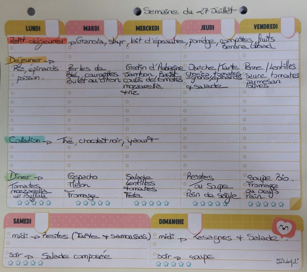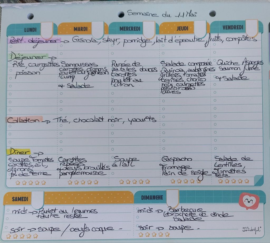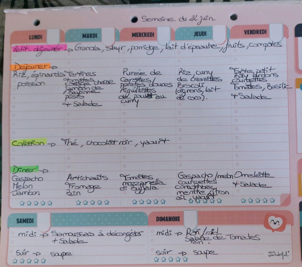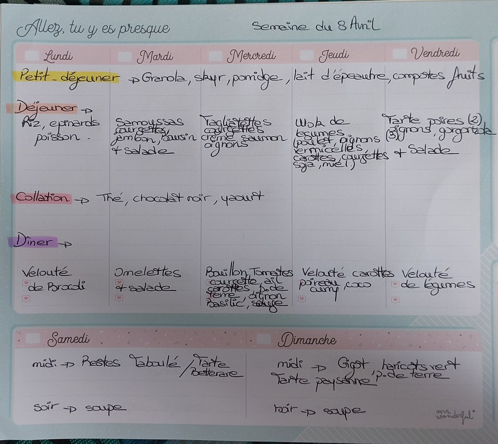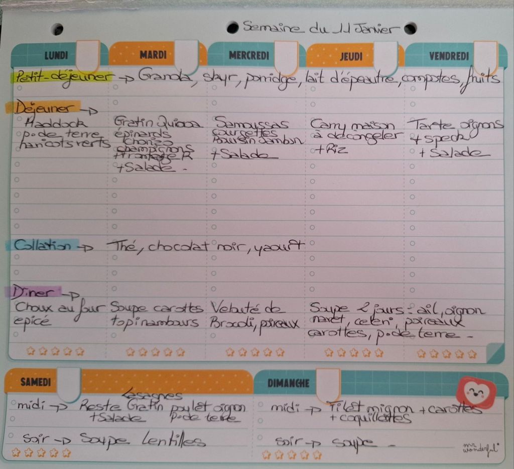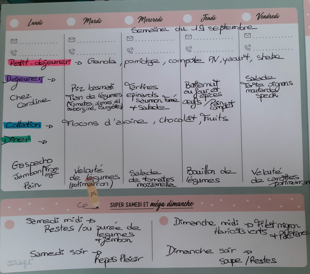 Pour créer mes menus, j’ai un semainier de la marque Mr Wonderful, il est pratique et permet de visualiser ta semaine en un clin d’œil !😉