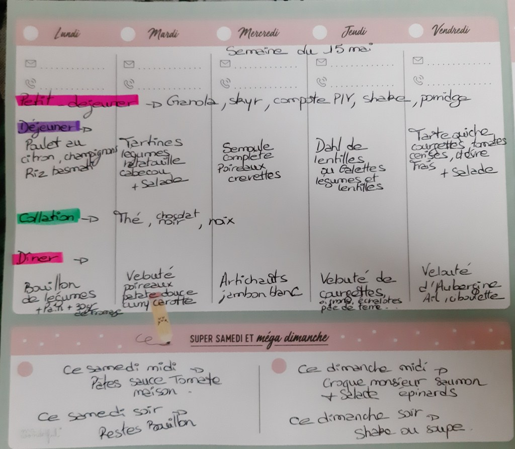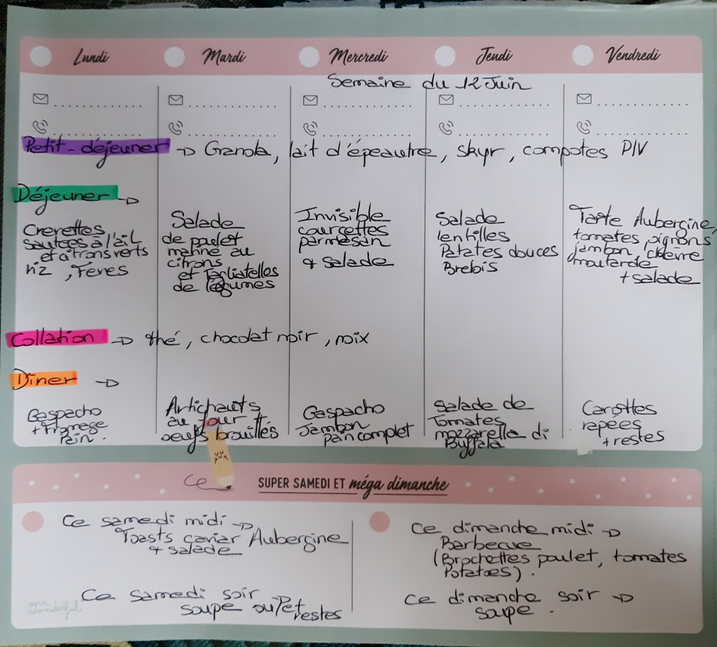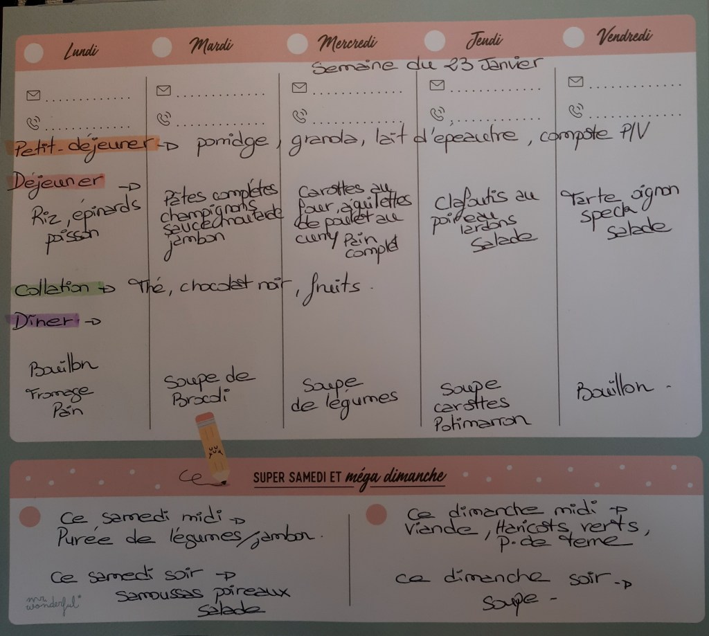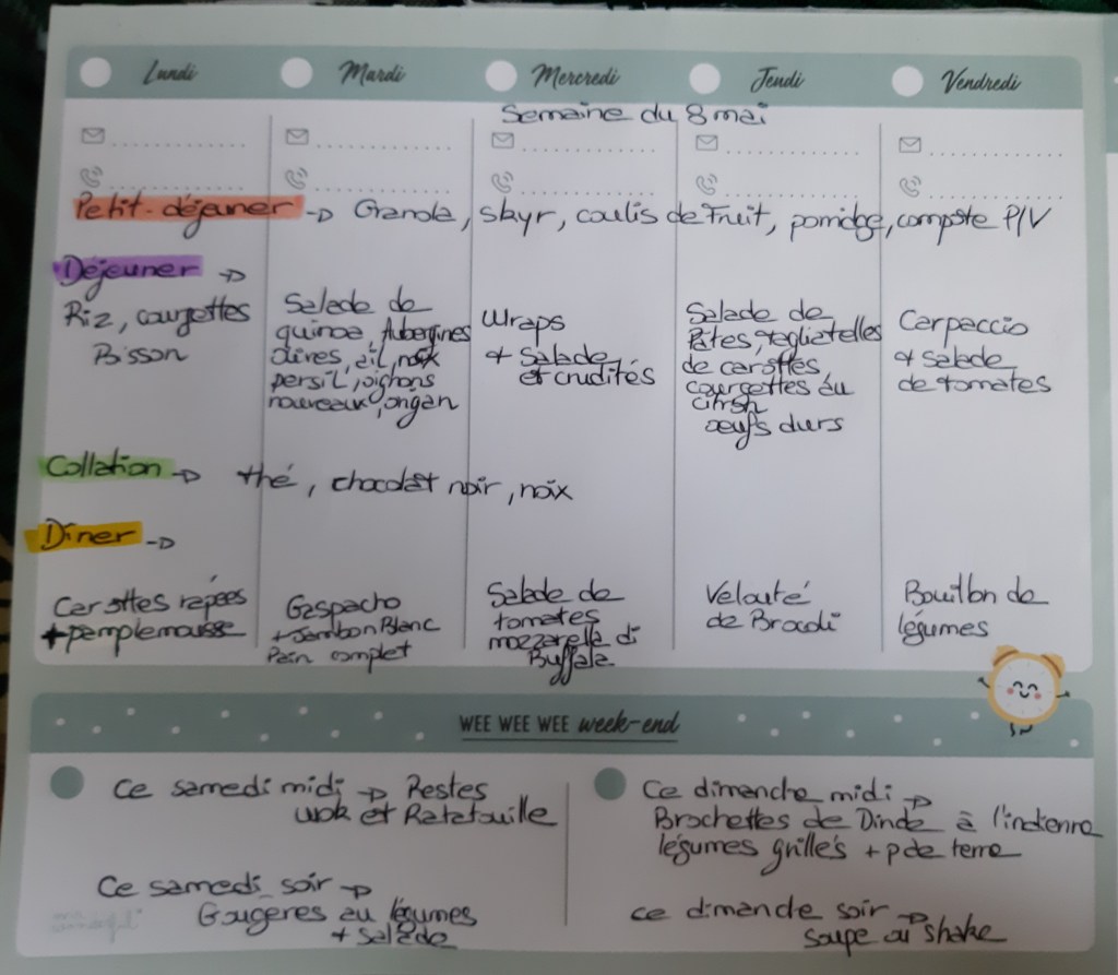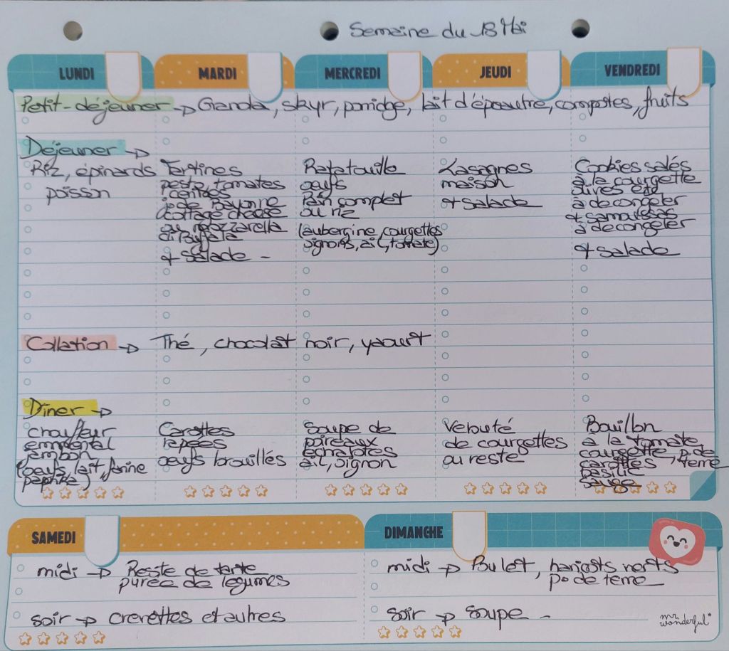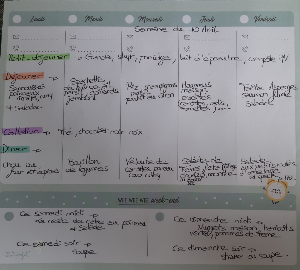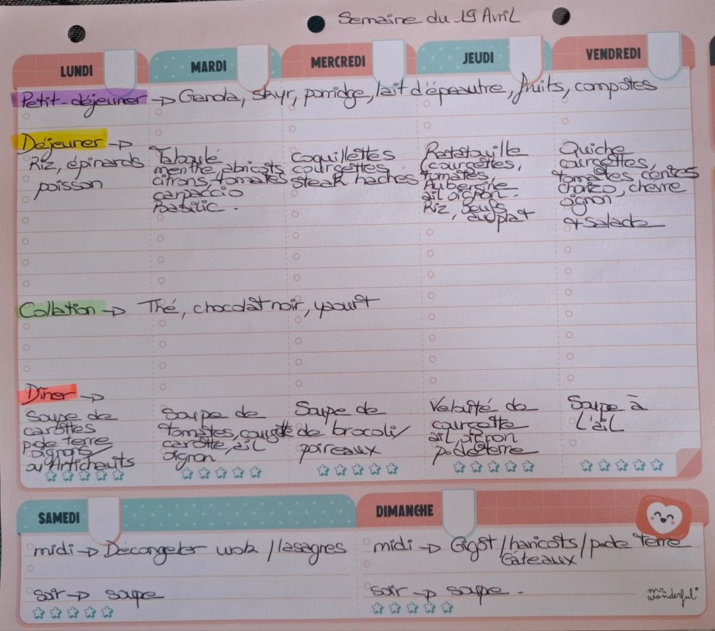 Pour créer mes menus, j’ai un semainier de la marque Mr Wonderful, il est pratique et permet de visualiser ta semaine en un clin d’œil !😉
