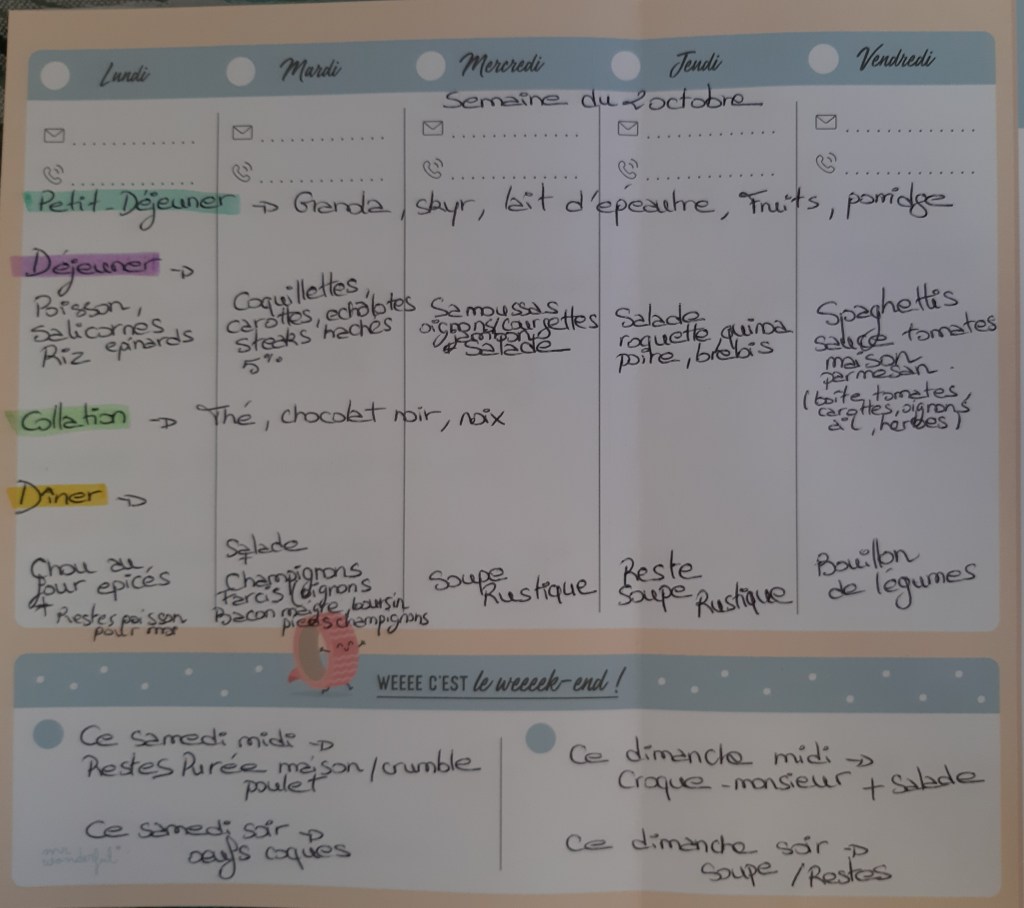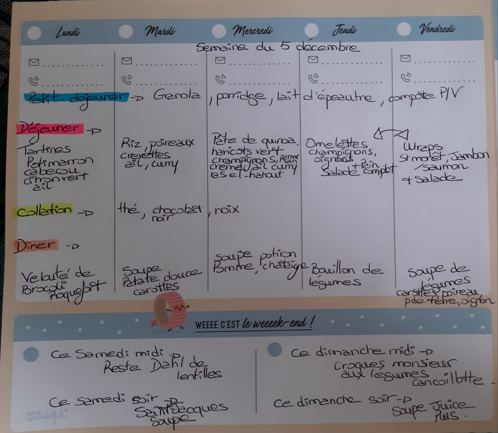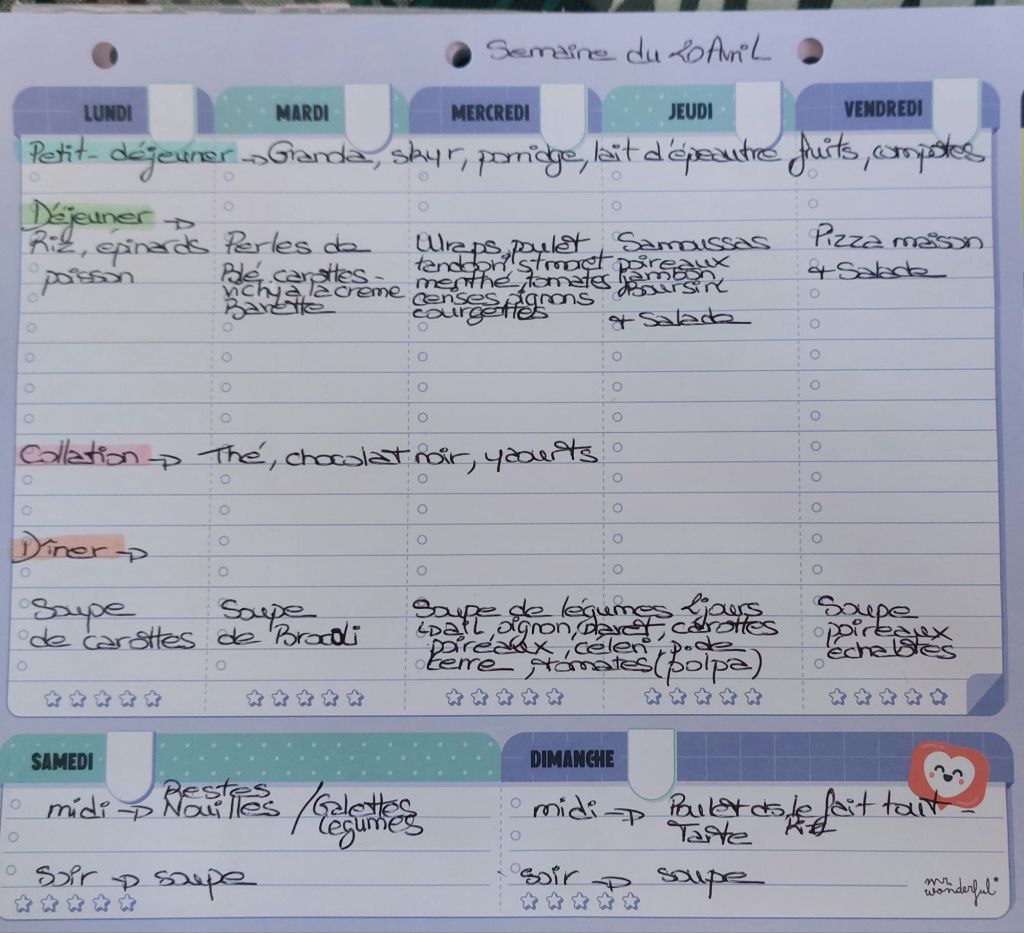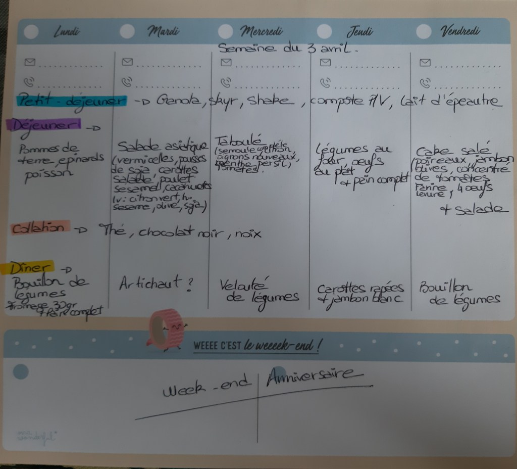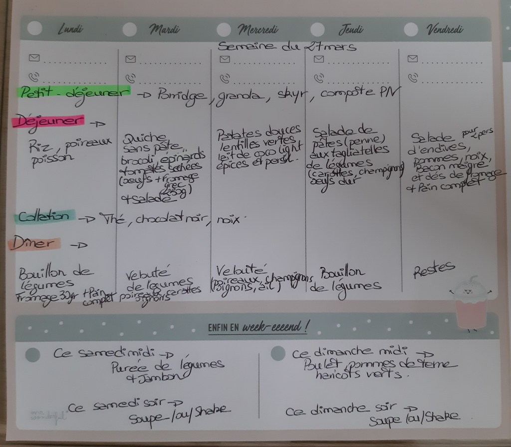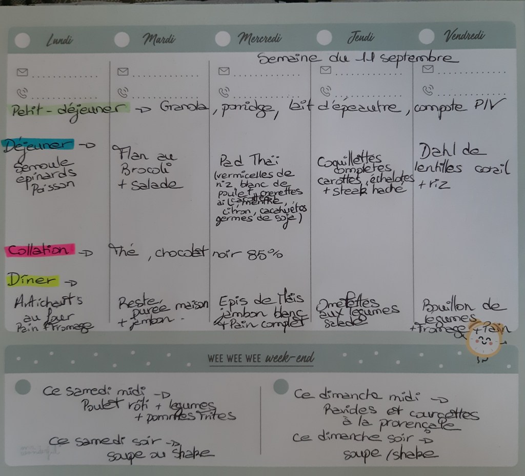 Pour créer mes menus, j’ai un semainier de la marque Mr Wonderful, il est pratique et permet de visualiser ta semaine en un clin d’œil !😉