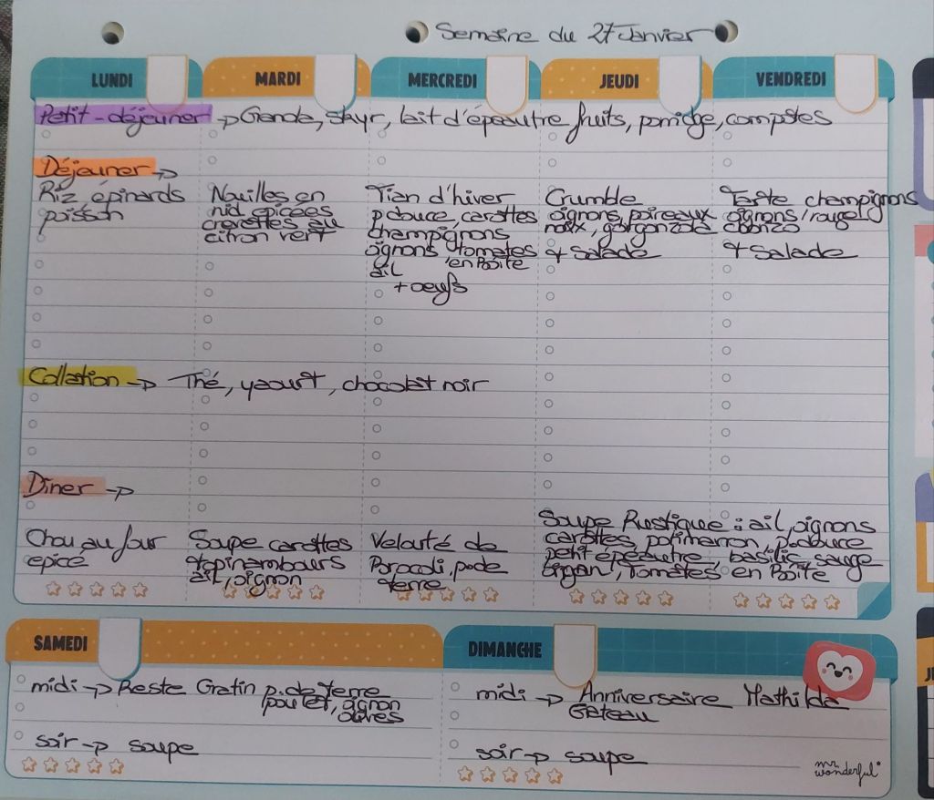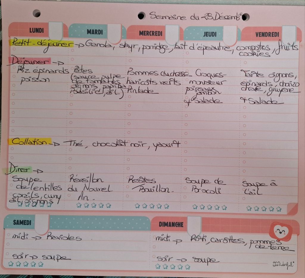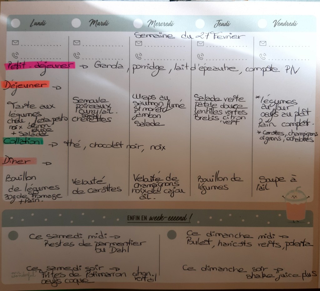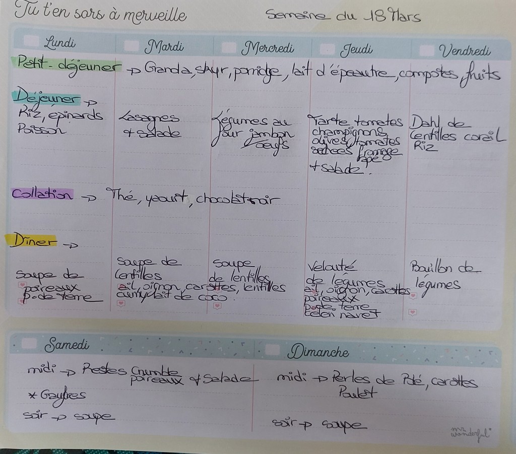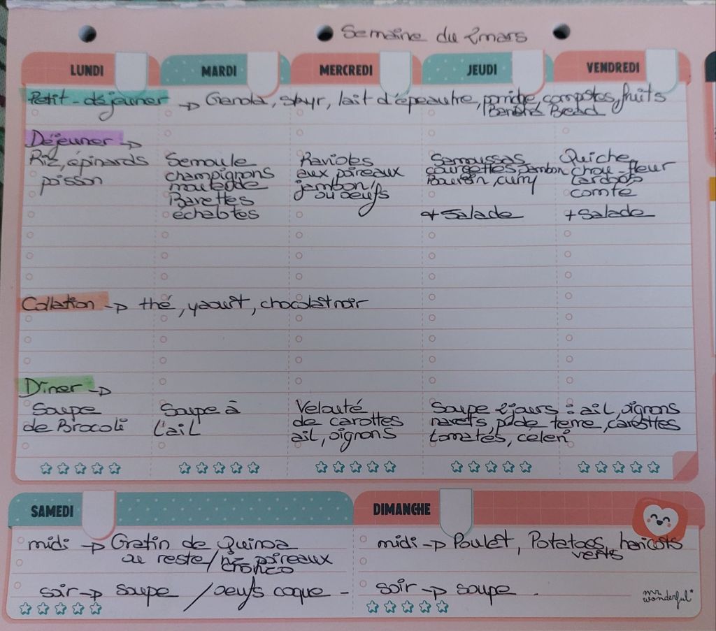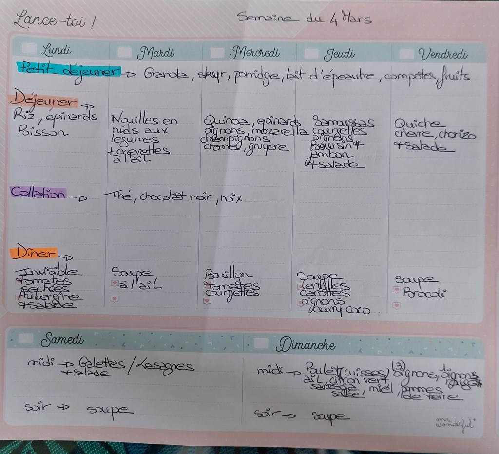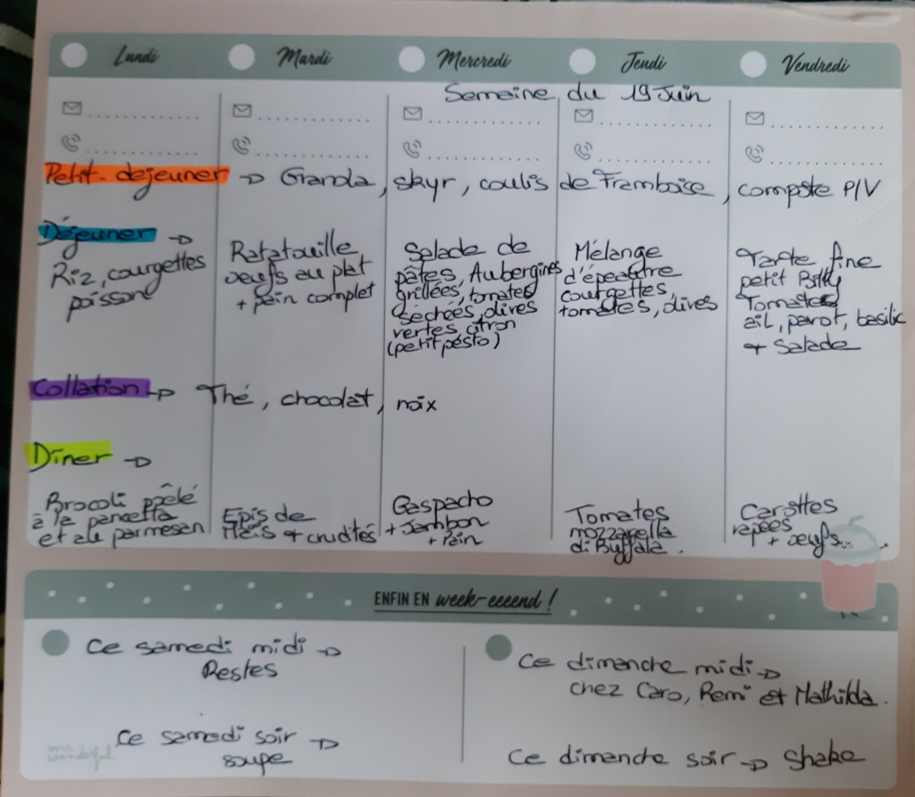 Pour créer mes menus, j’ai un semainier de la marque Mr Wonderful, il est pratique et permet de visualiser ta semaine en un clin d’œil !😉