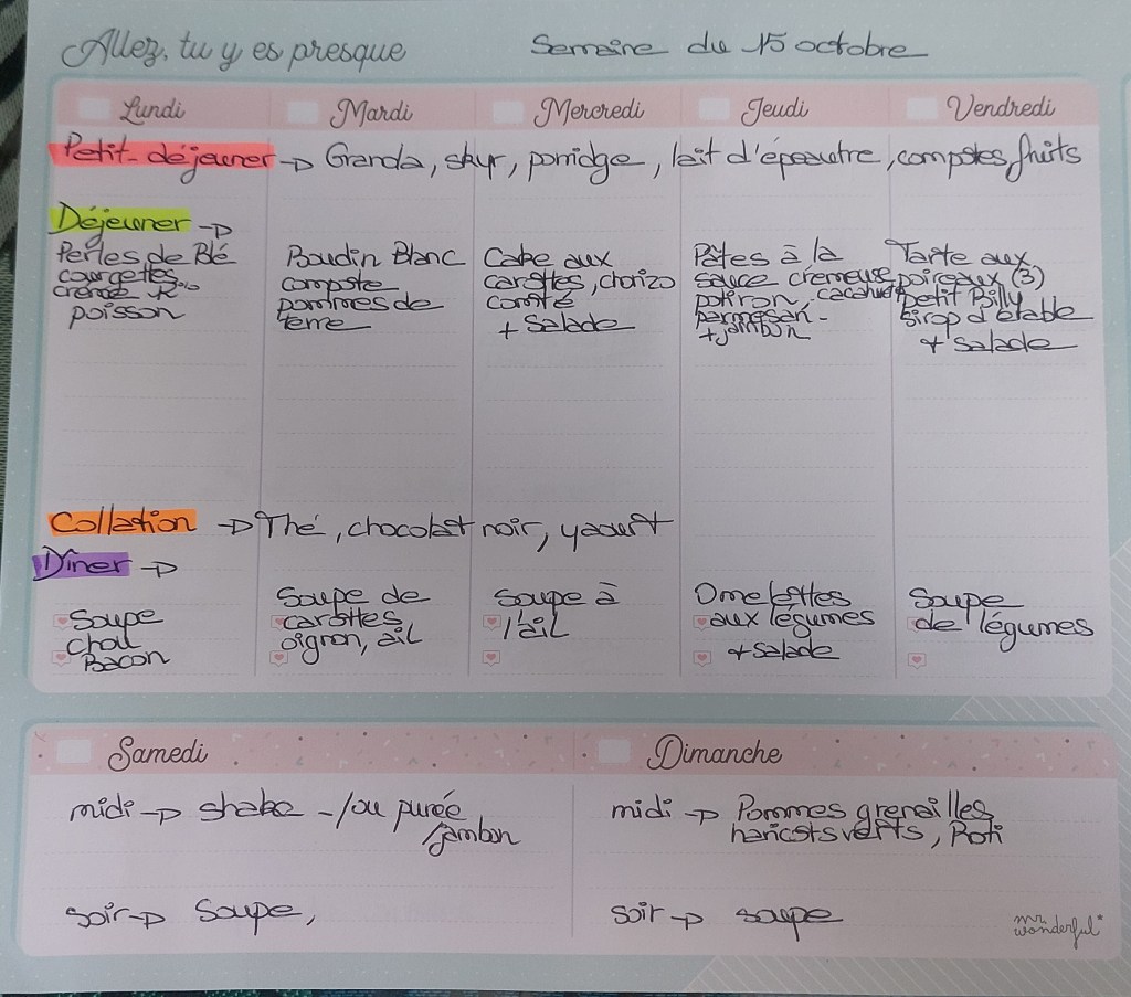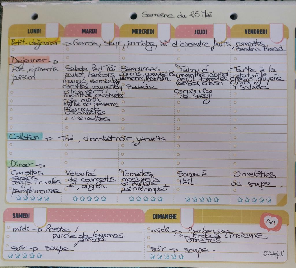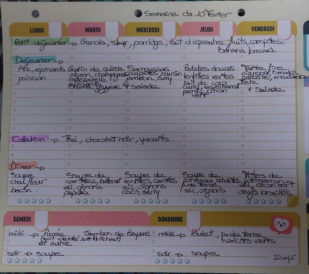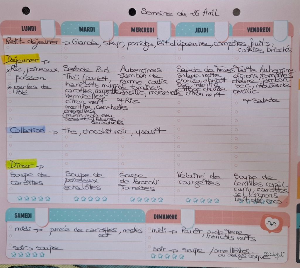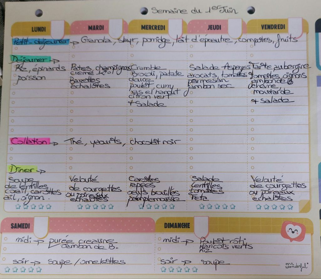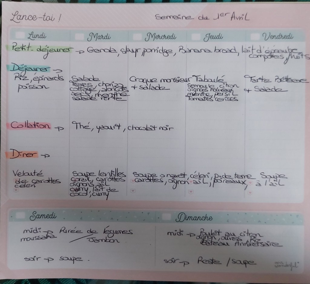 Pour créer mes menus, j’ai un semainier de la marque Mr Wonderful, il est pratique et permet de visualiser ta semaine en un clin d’œil !😉