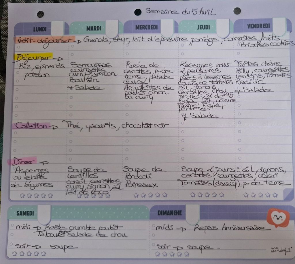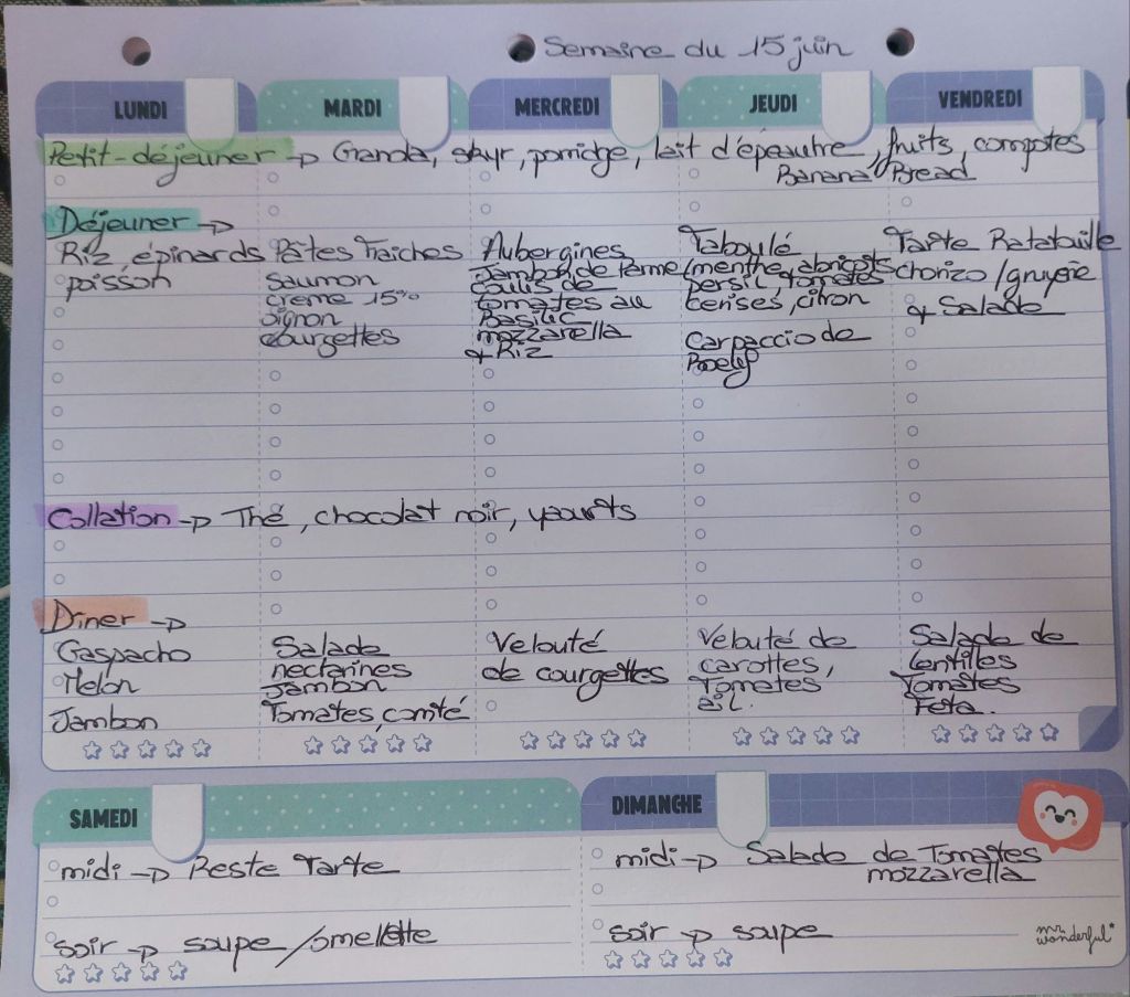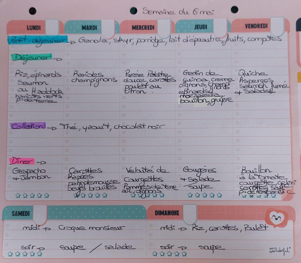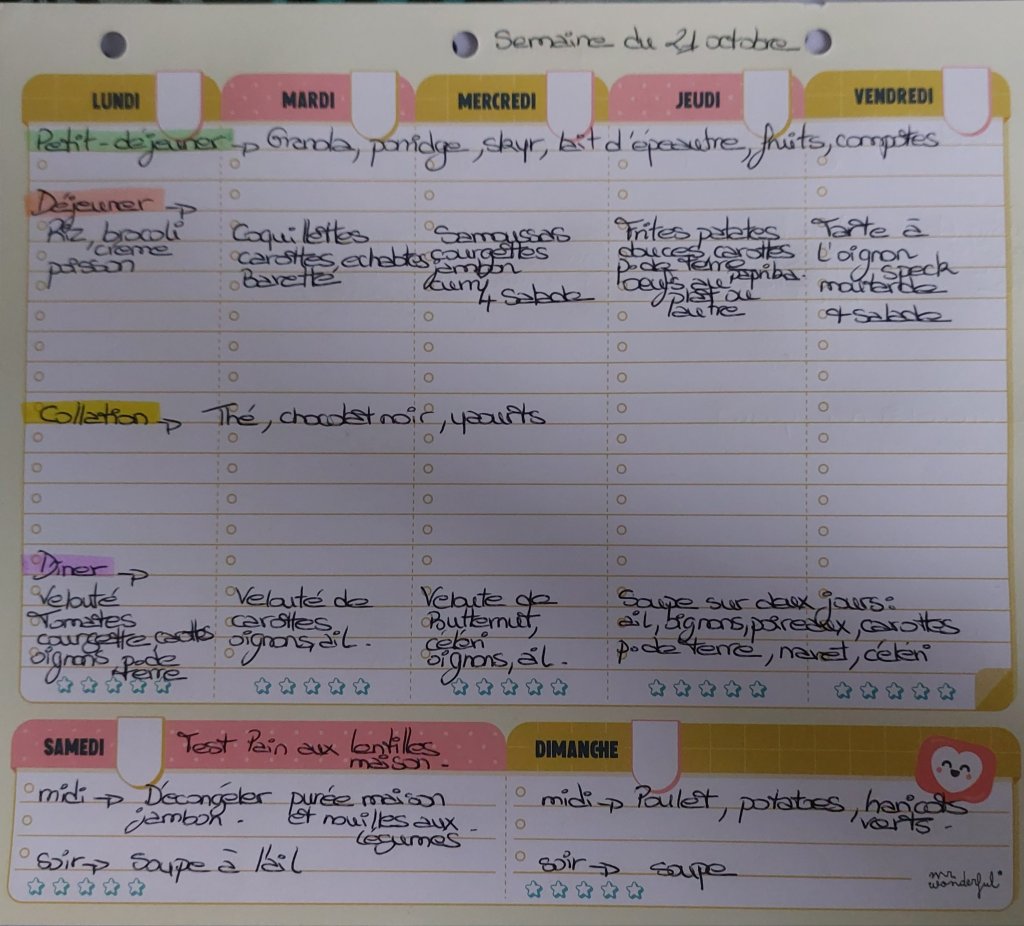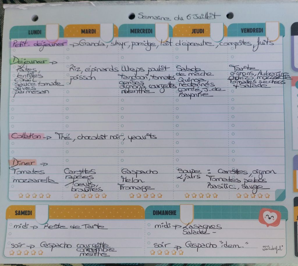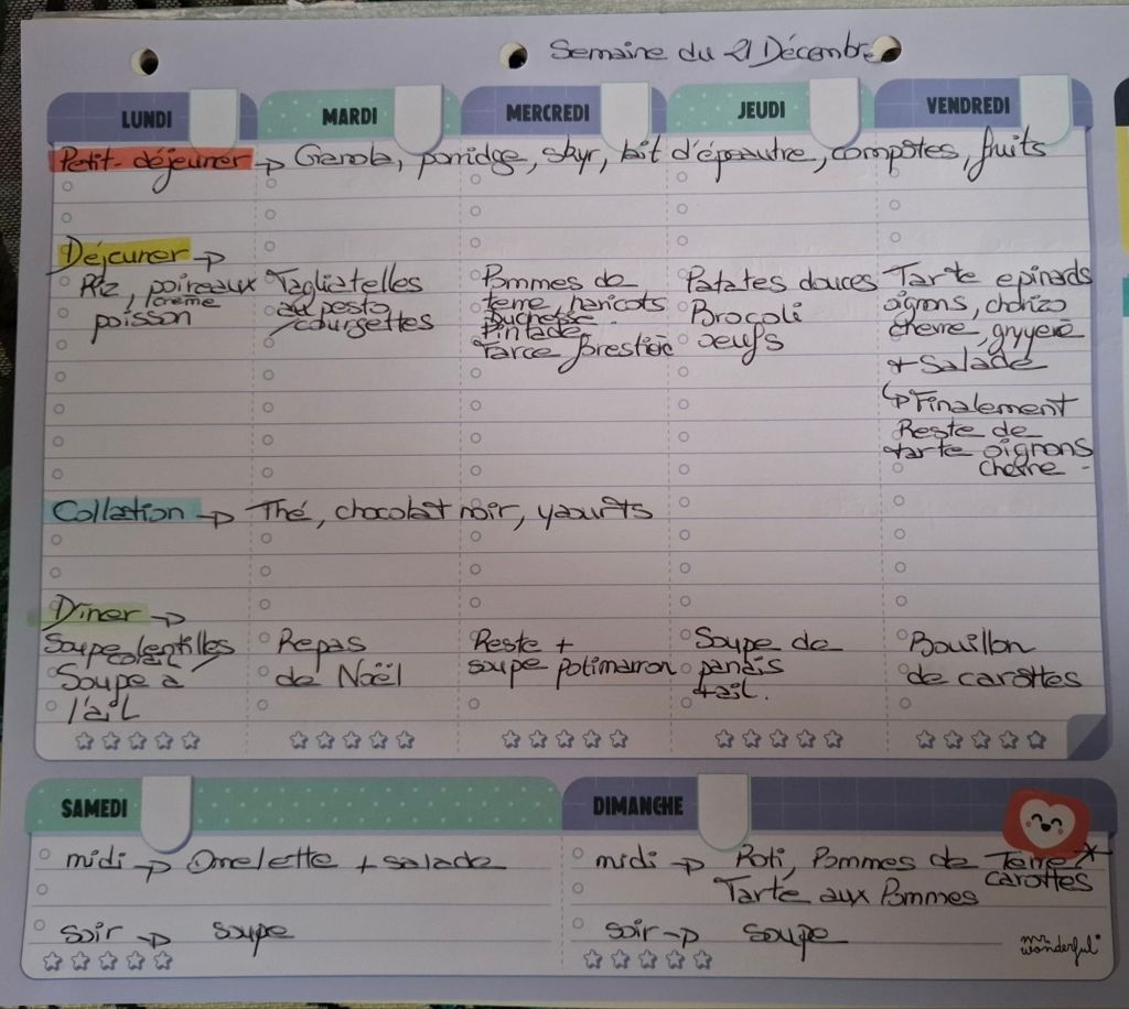 Pour créer mes menus, j’ai un semainier de la marque Mr Wonderful, il est pratique et permet de visualiser ta semaine en un clin d’œil !😉