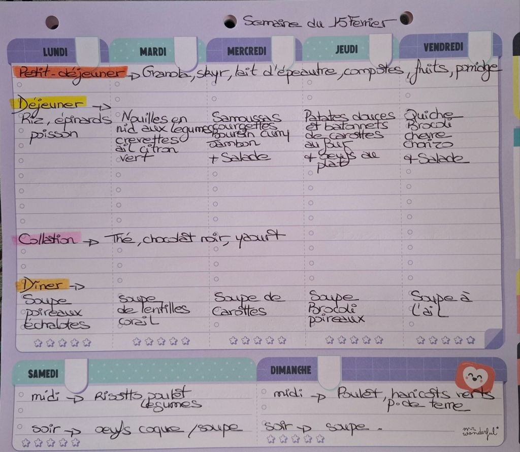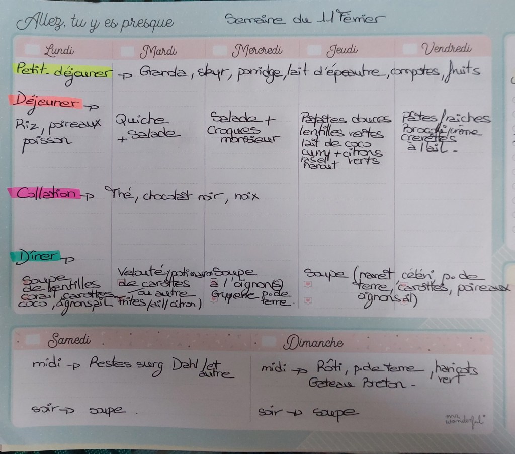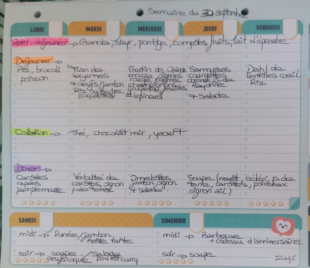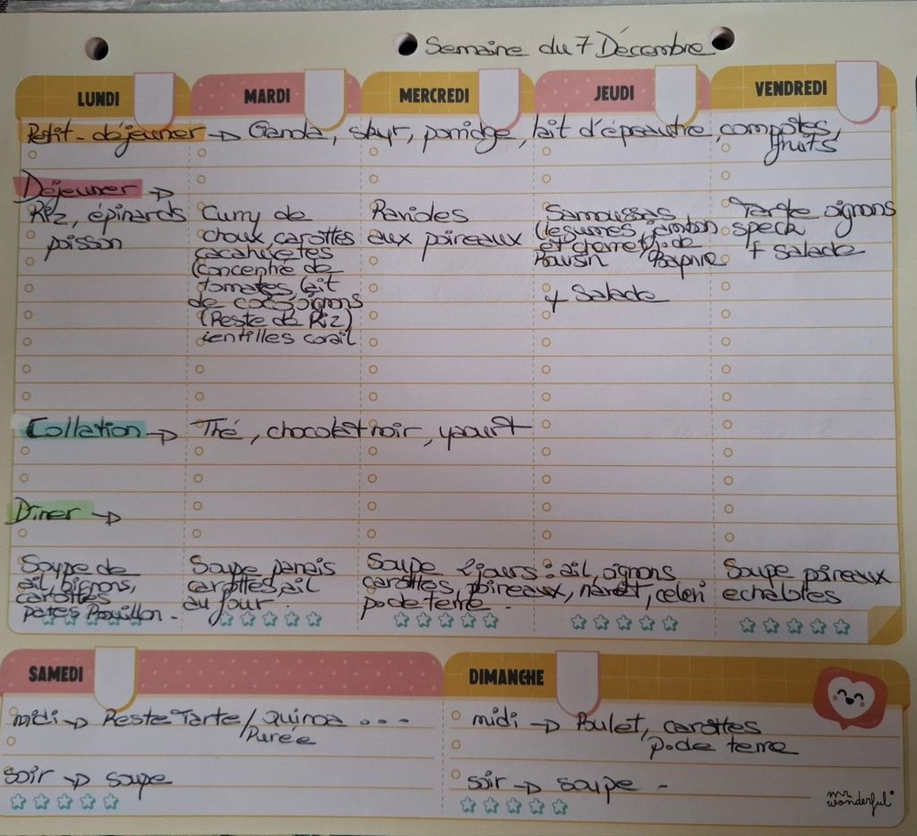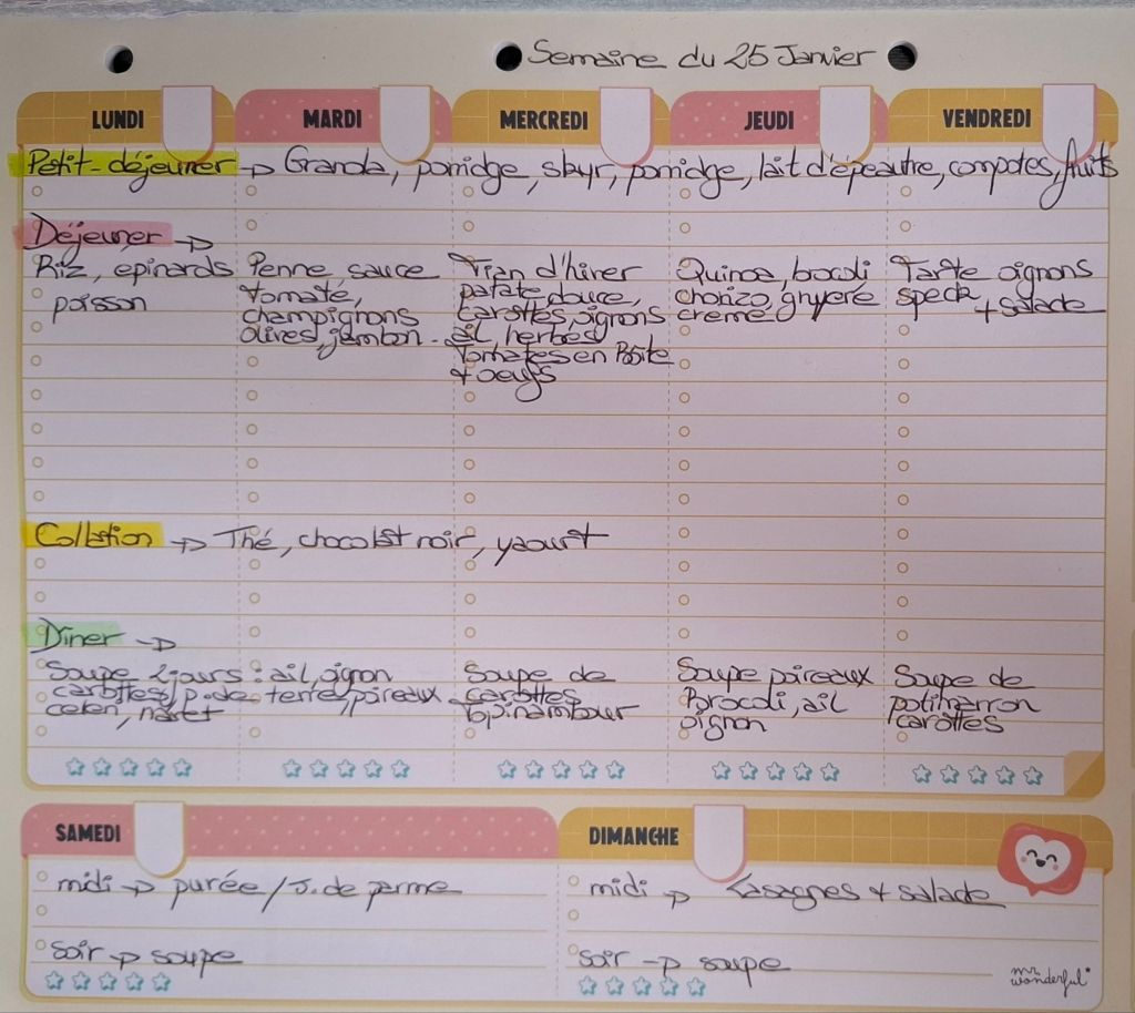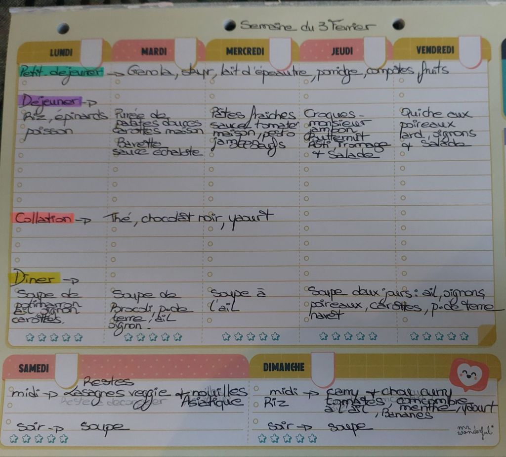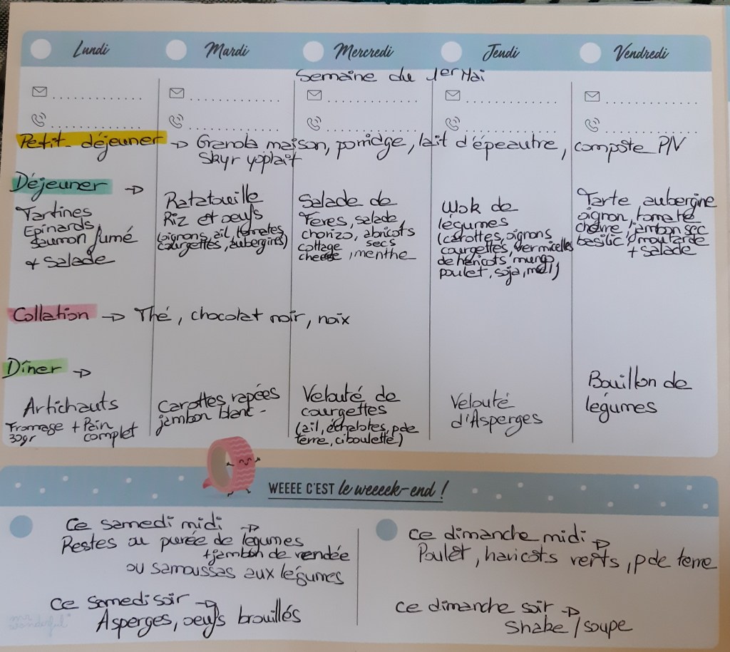 Pour créer mes menus, j’ai un semainier de la marque Mr Wonderful, il est pratique et permet de visualiser ta semaine en un clin d’œil !😉