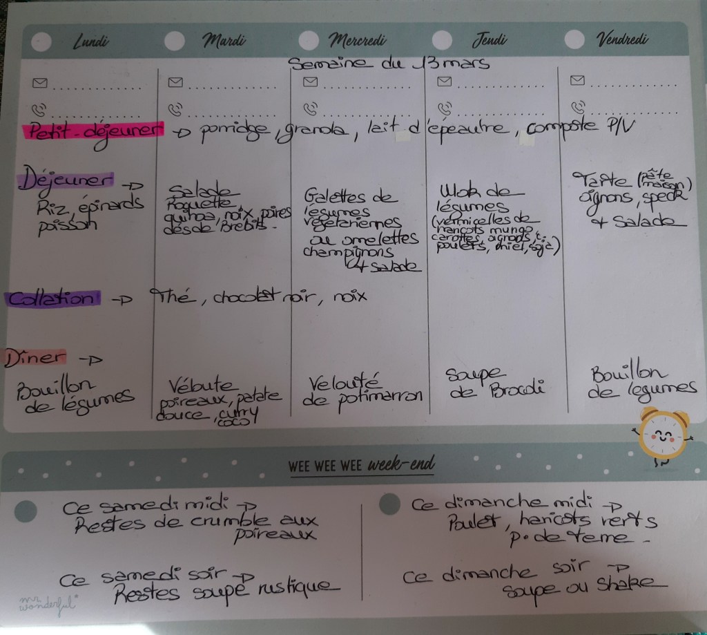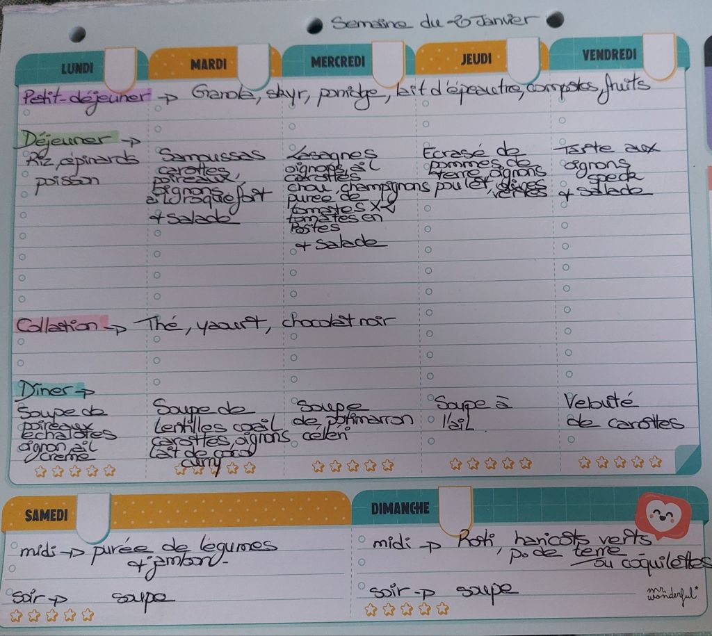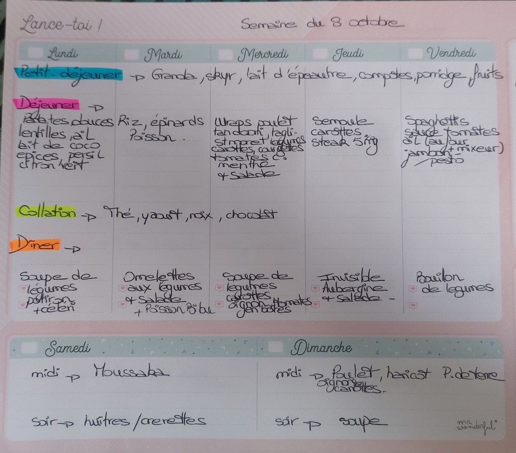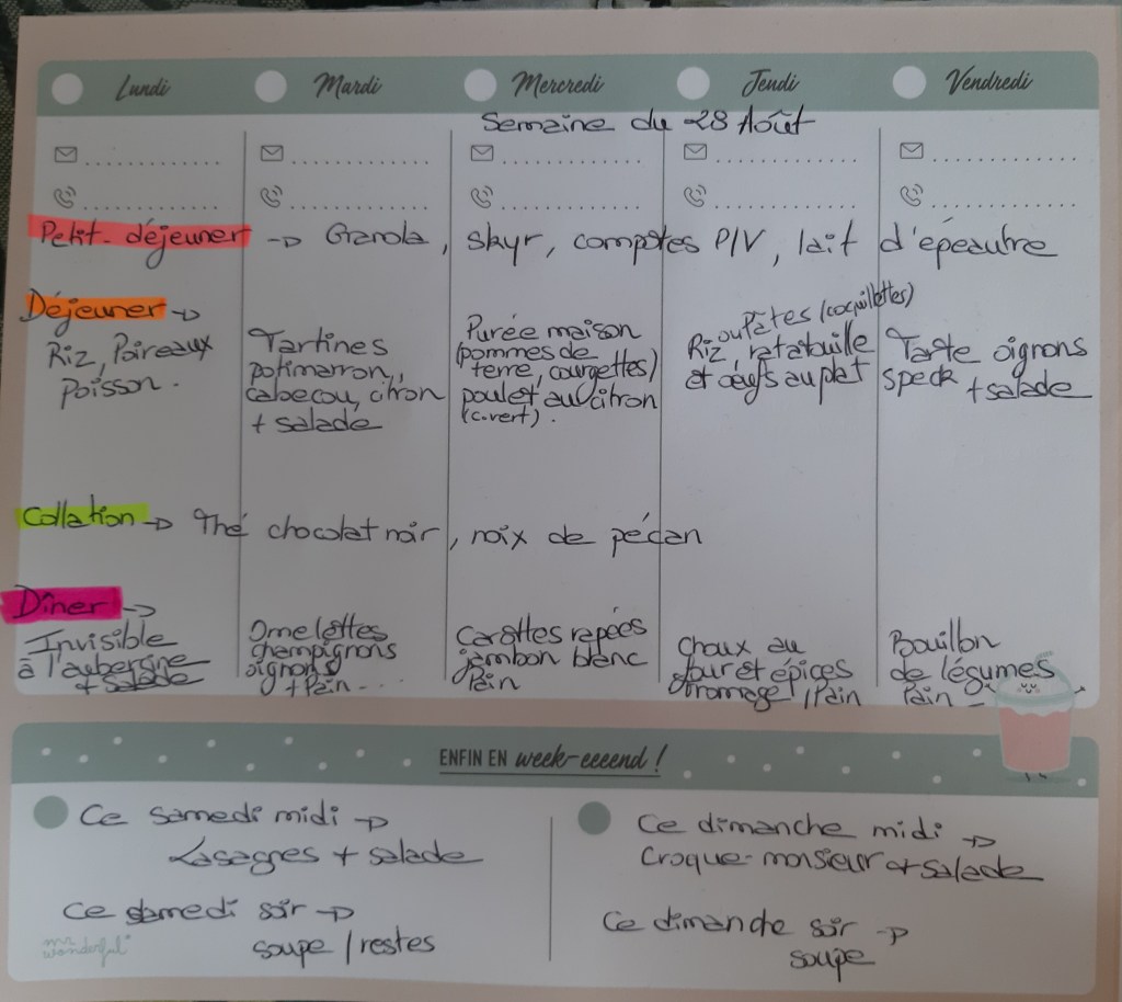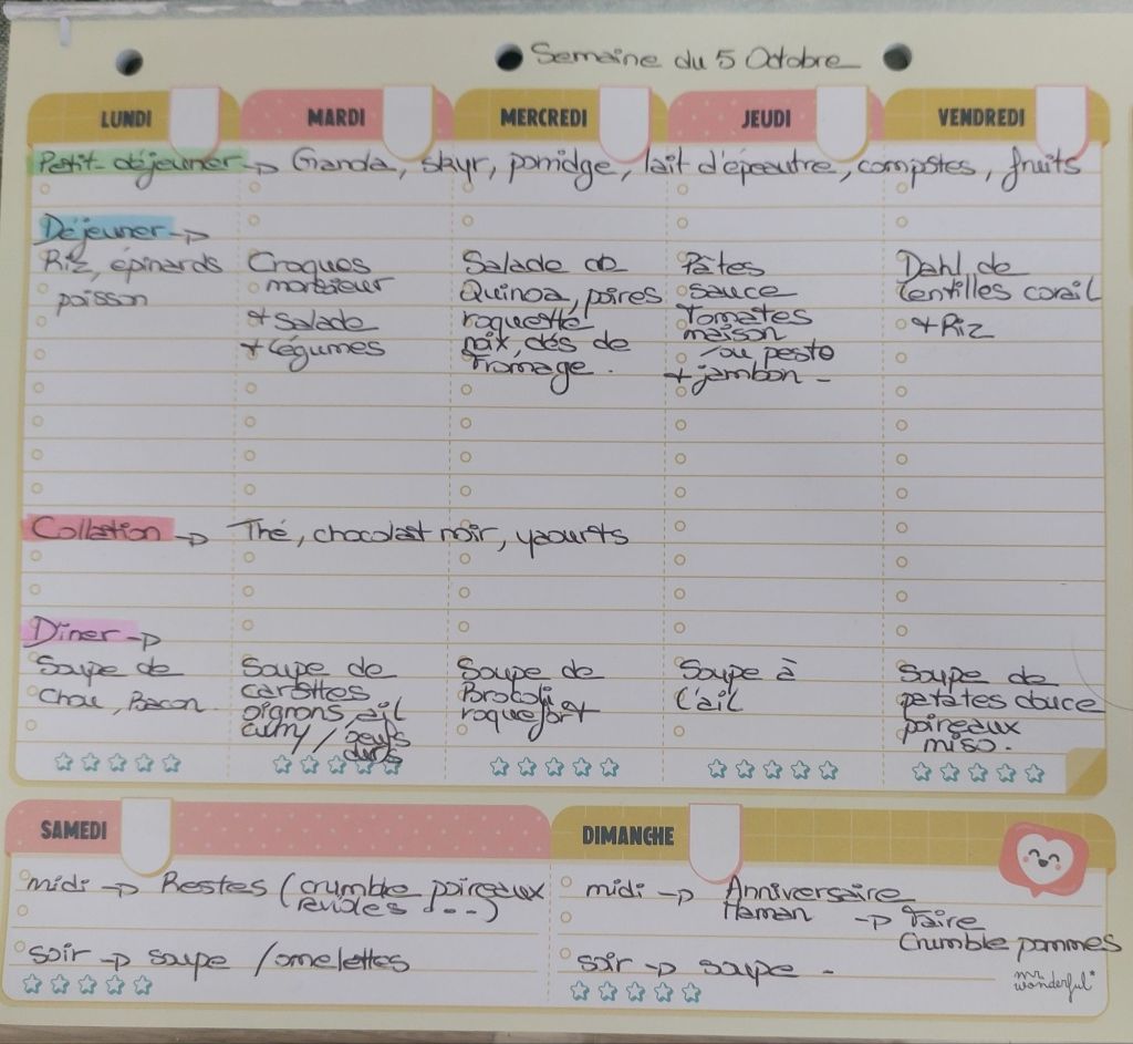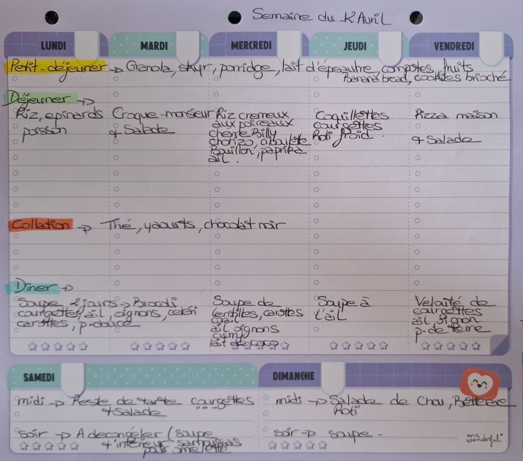 Pour créer mes menus, j’ai un semainier de la marque Mr Wonderful, il est pratique et permet de visualiser ta semaine en un clin d’œil !😉