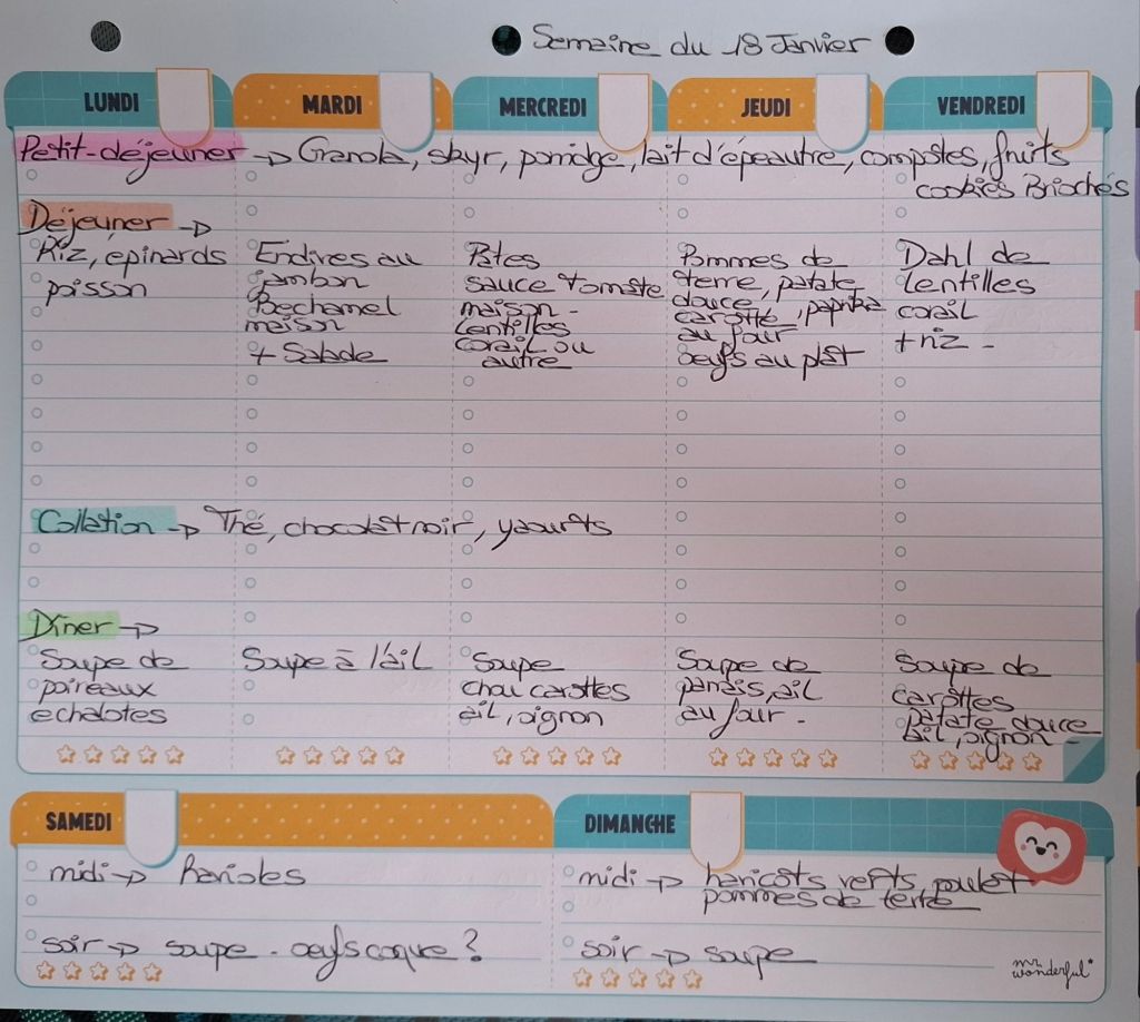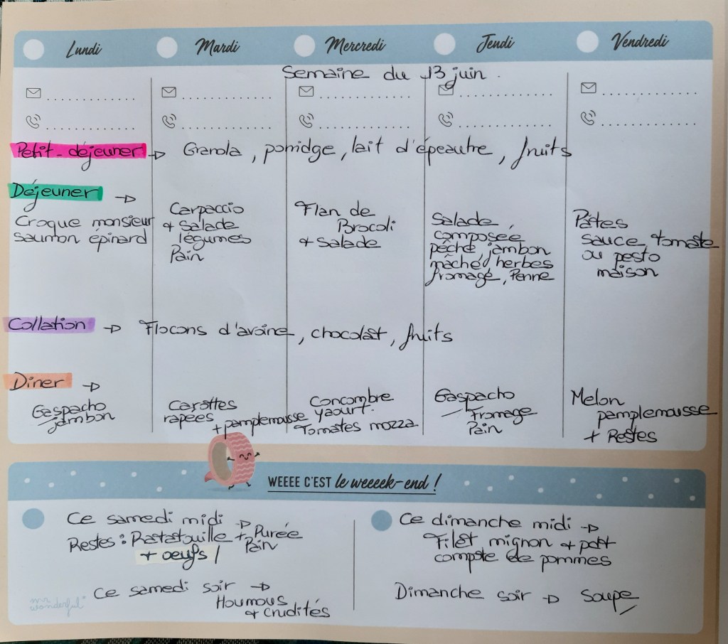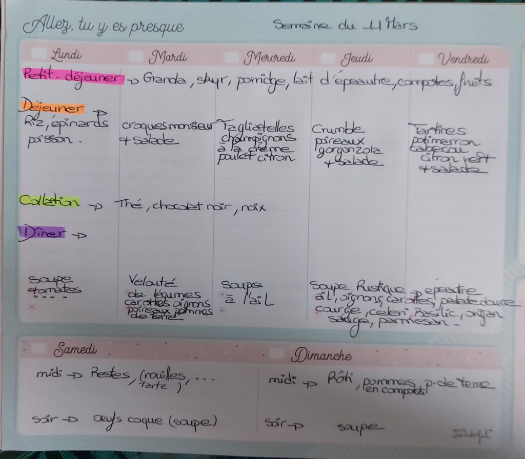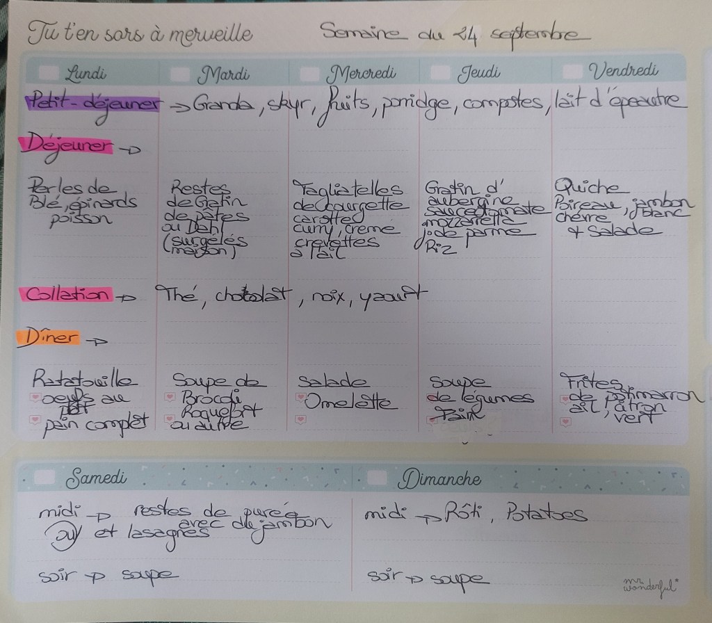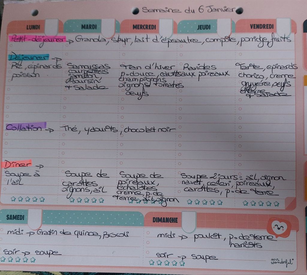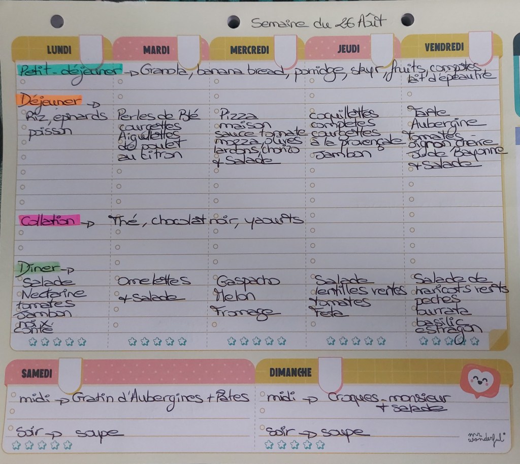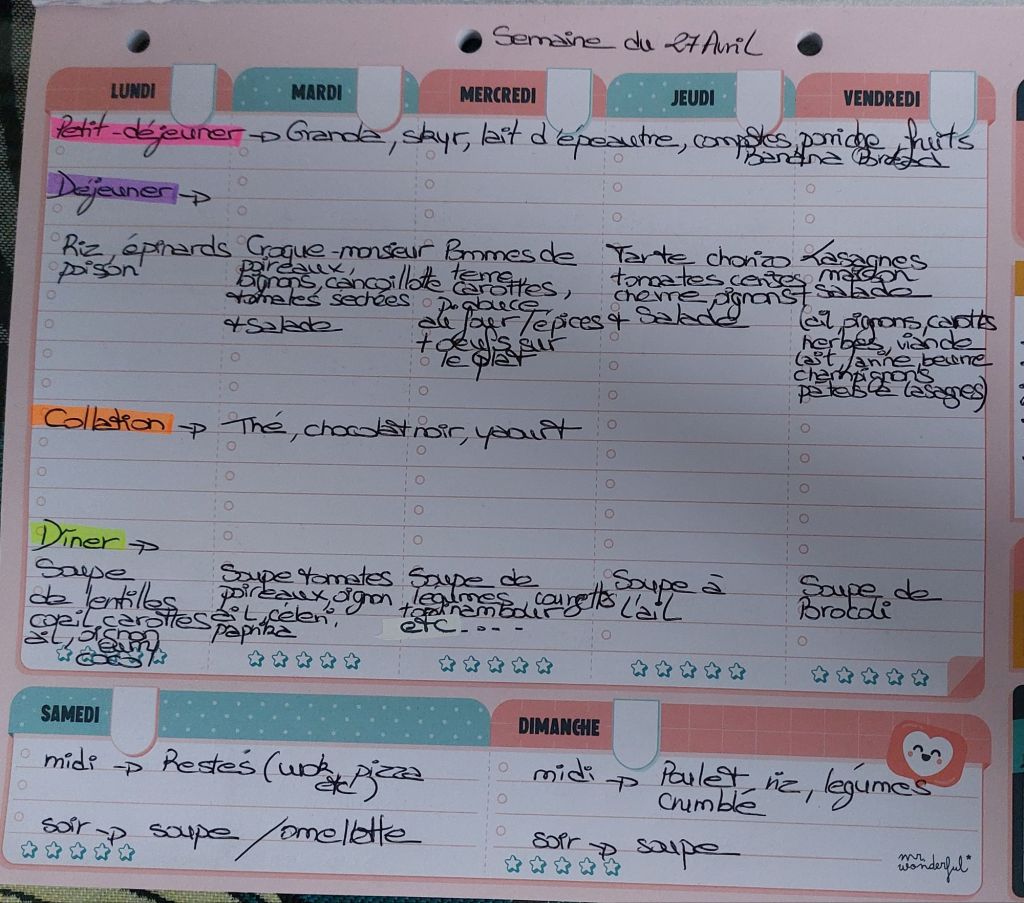 Pour créer mes menus, j’ai un semainier de la marque Mr Wonderful, il est pratique et permet de visualiser ta semaine en un clin d’œil !😉