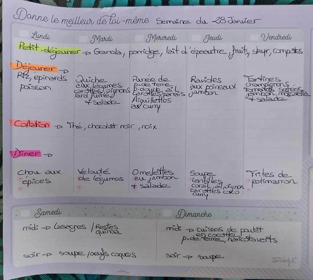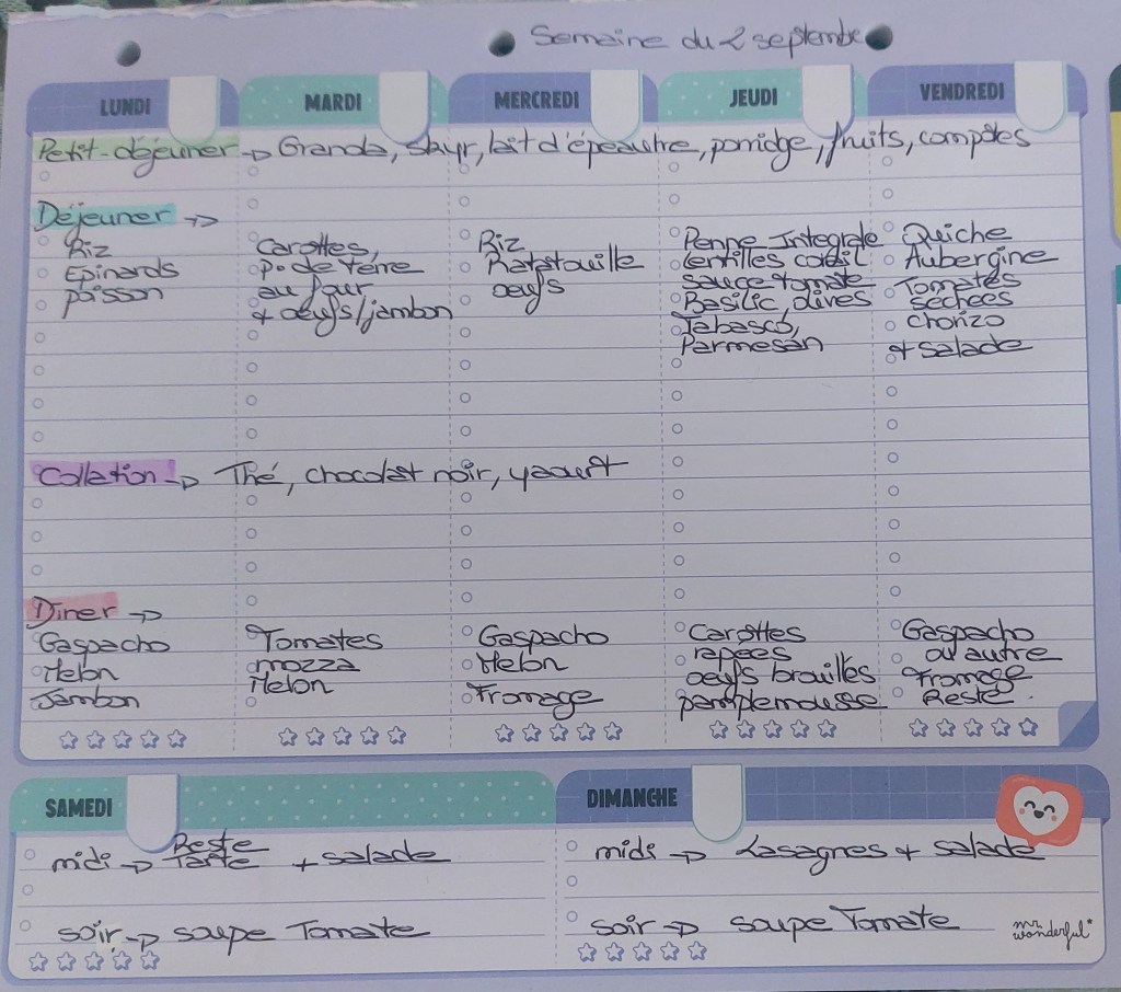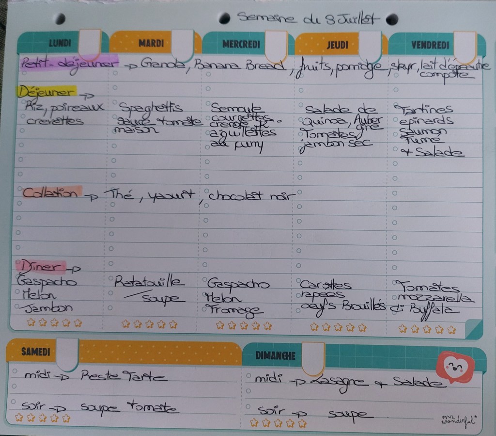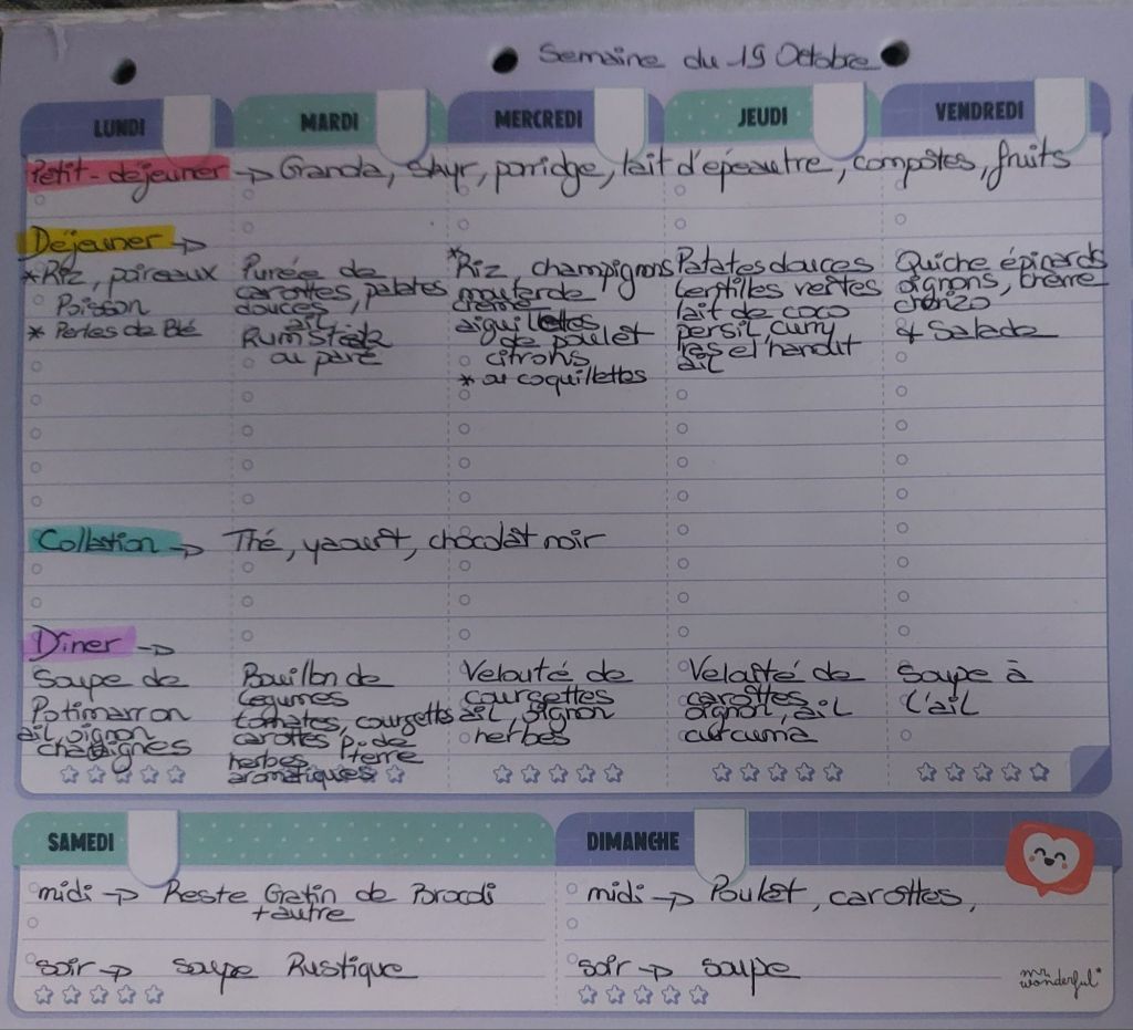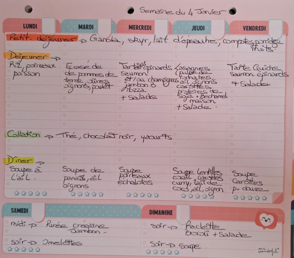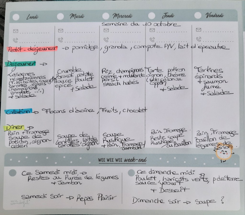 Pour créer mes menus, j’ai un semainier de la marque Mr Wonderful, il est pratique et permet de visualiser ta semaine en un clin d’œil !😉