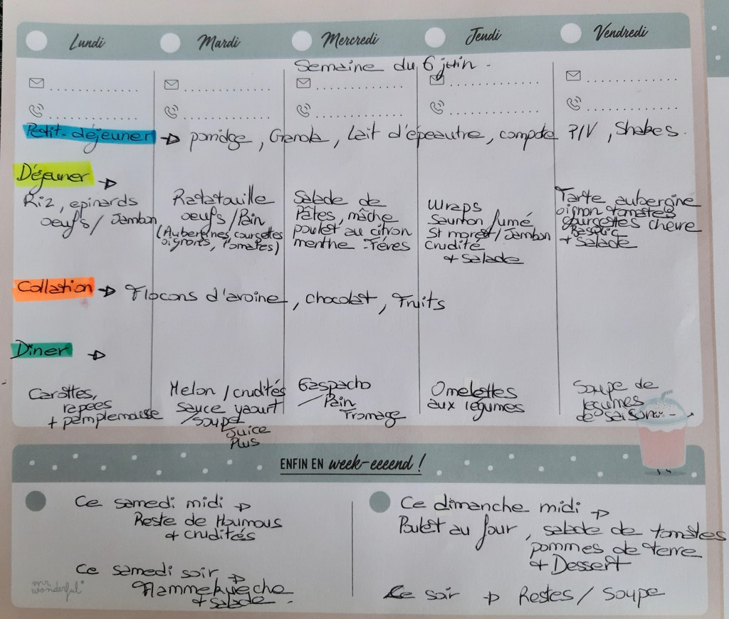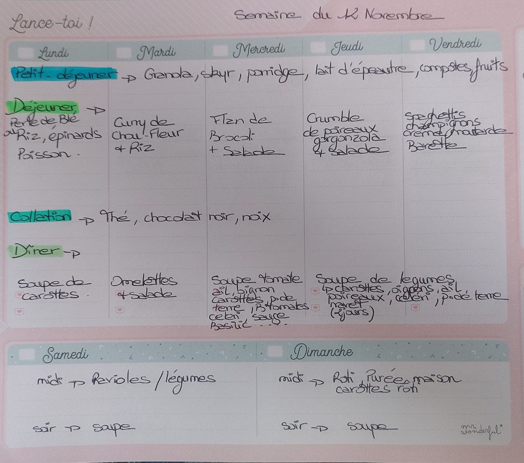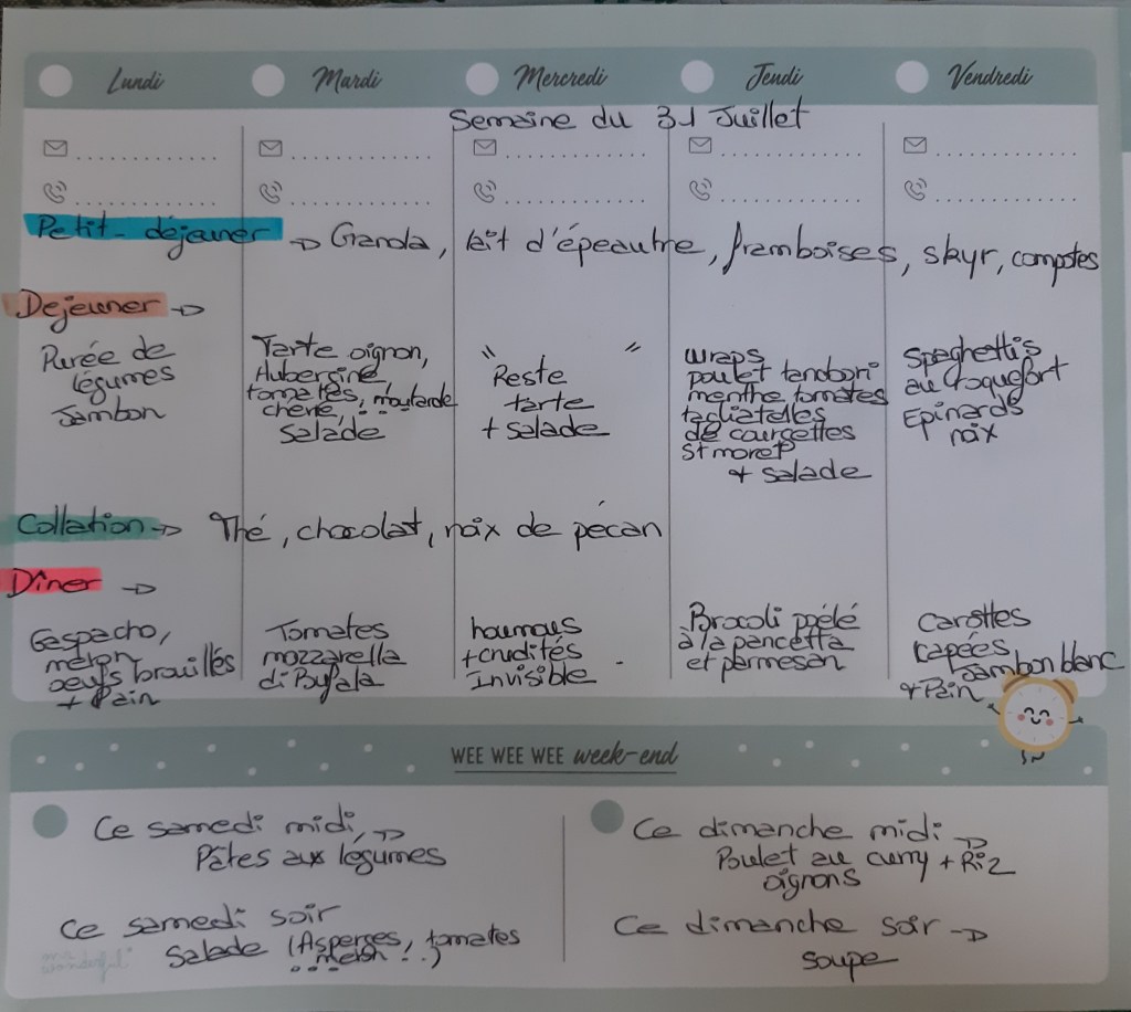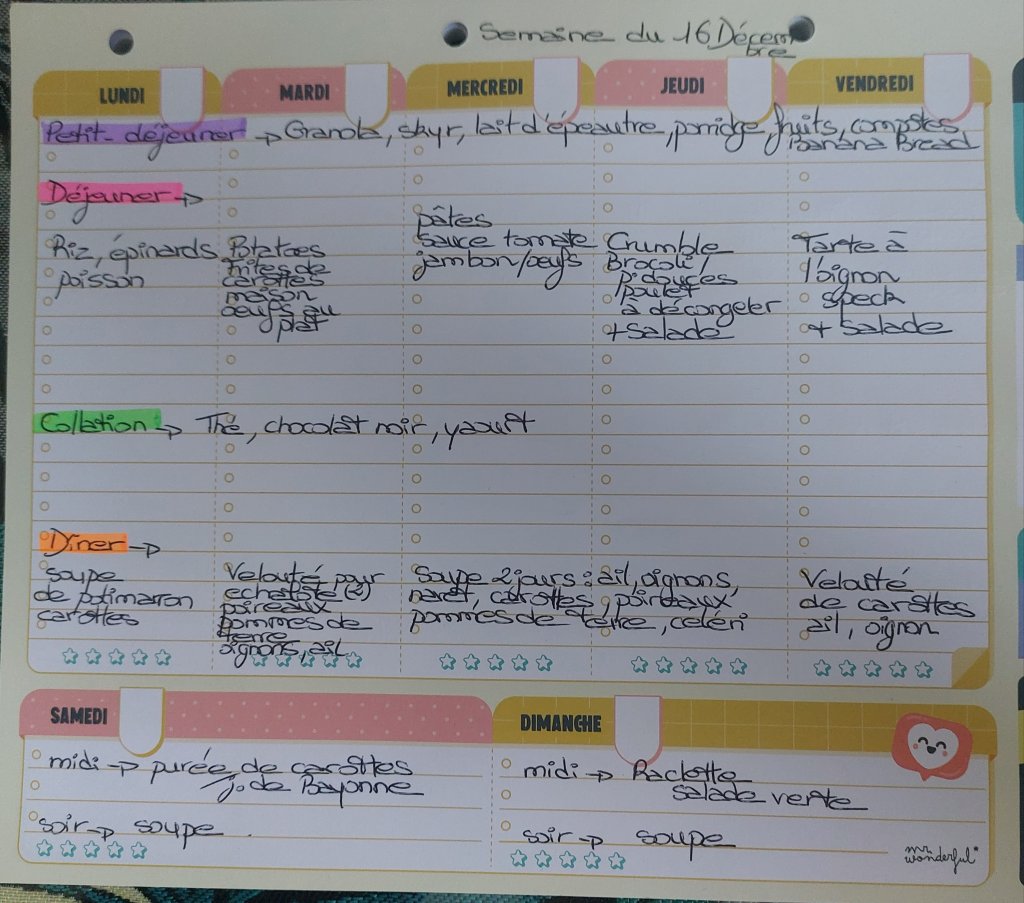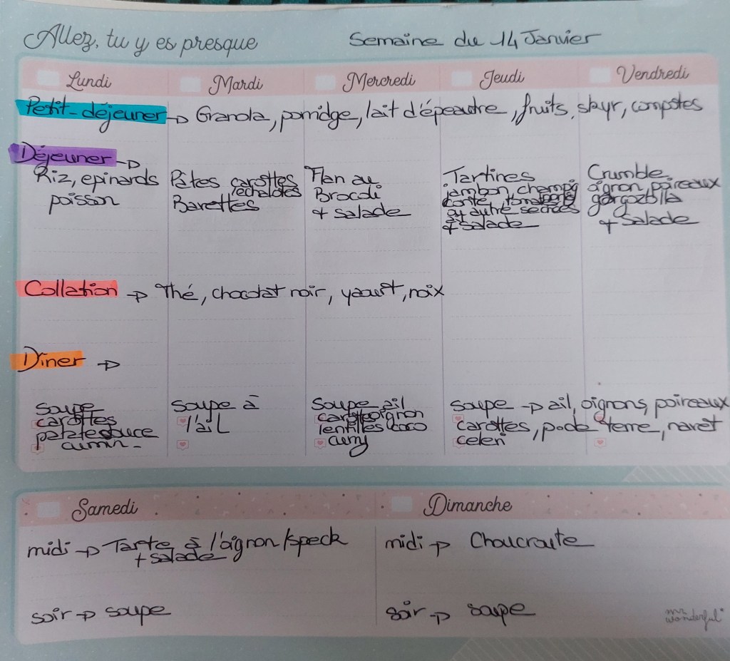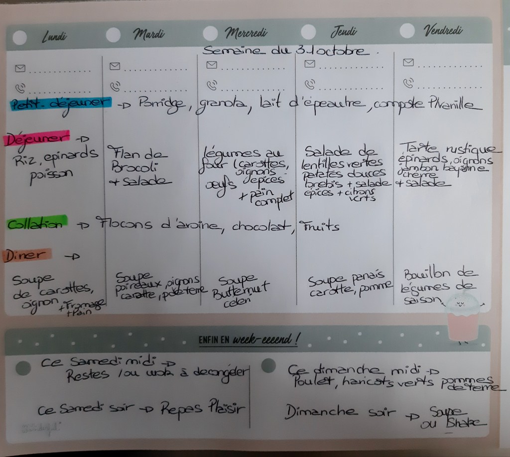 Pour créer mes menus, j’ai un semainier de la marque Mr Wonderful, il est pratique et permet de visualiser ta semaine en un clin d’œil !😉