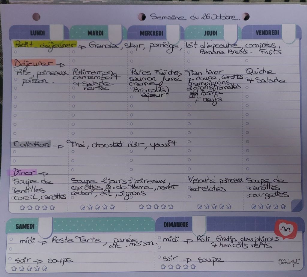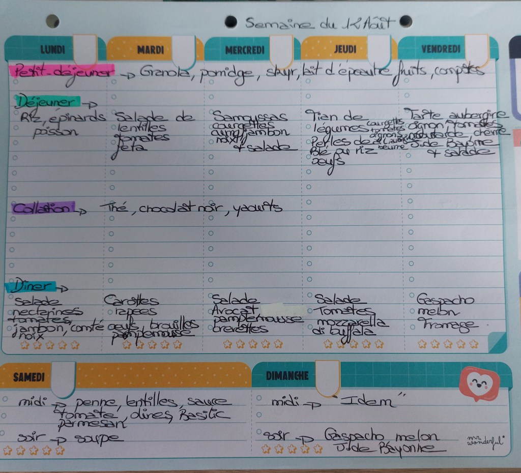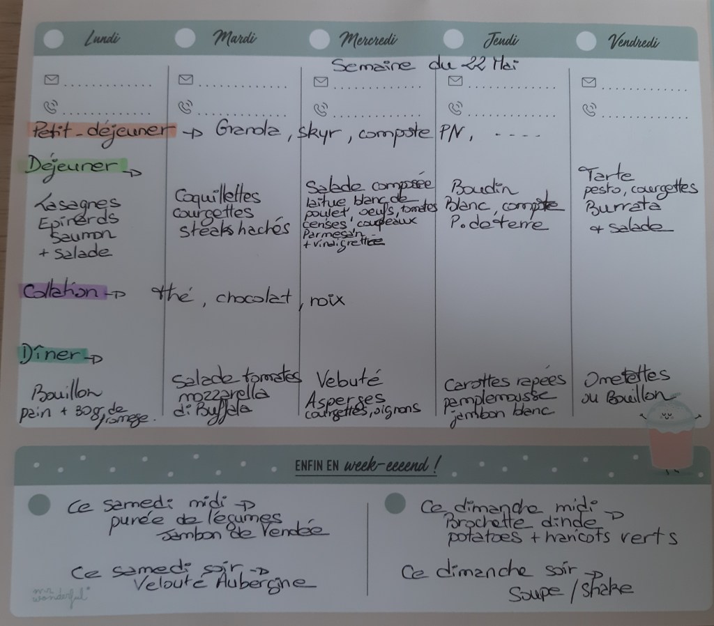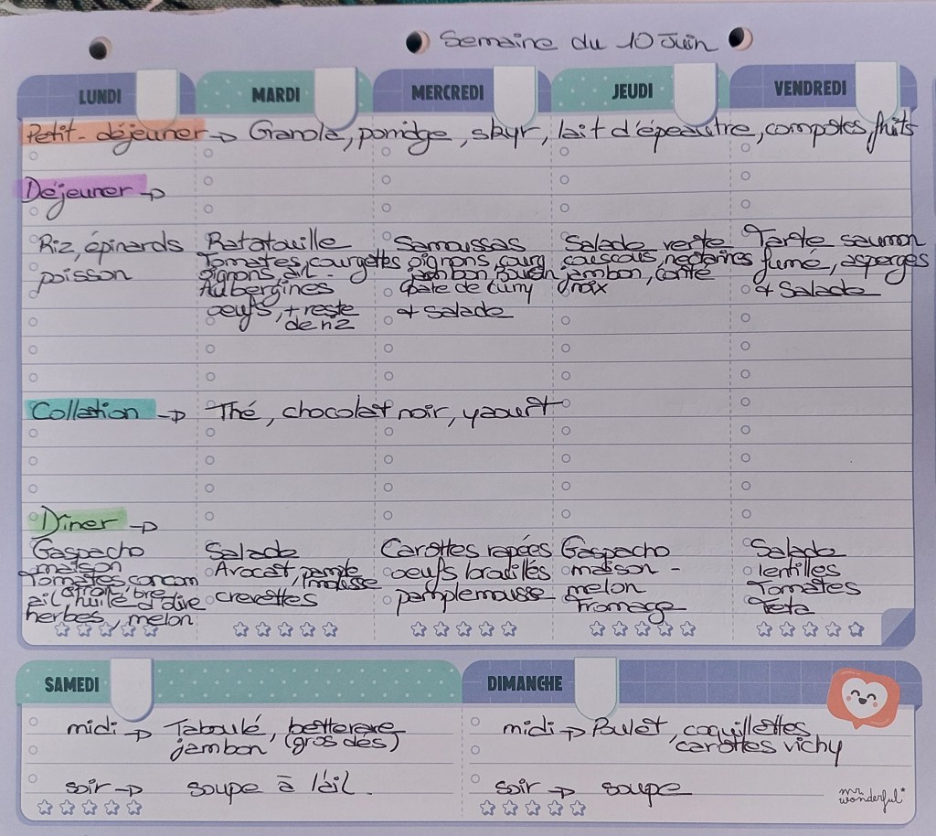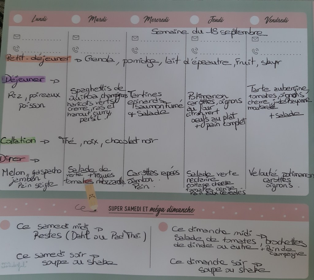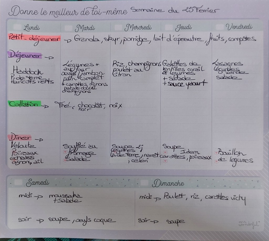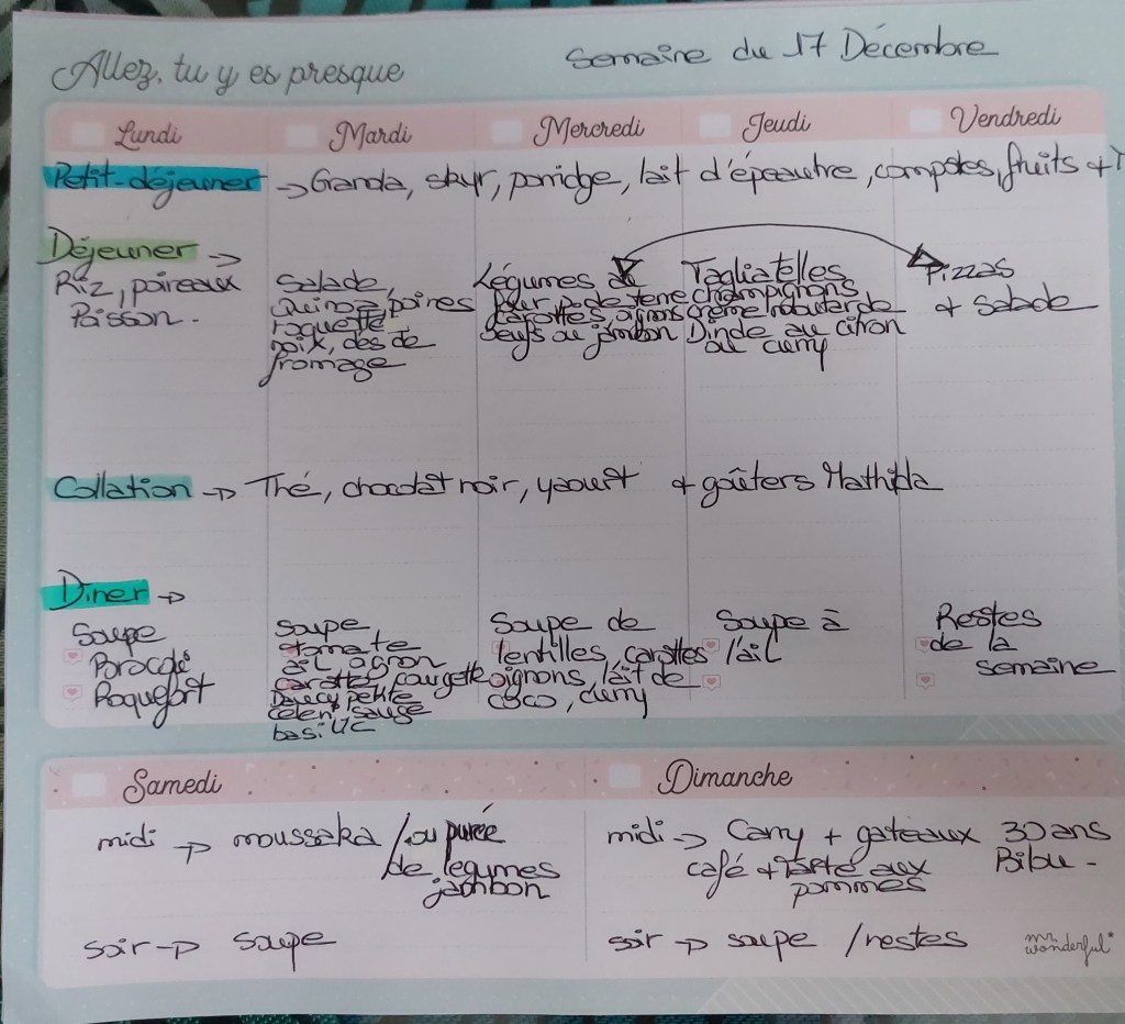 Pour créer mes menus, j’ai un semainier de la marque Mr Wonderful, il est pratique et permet de visualiser ta semaine en un clin d’œil !😉