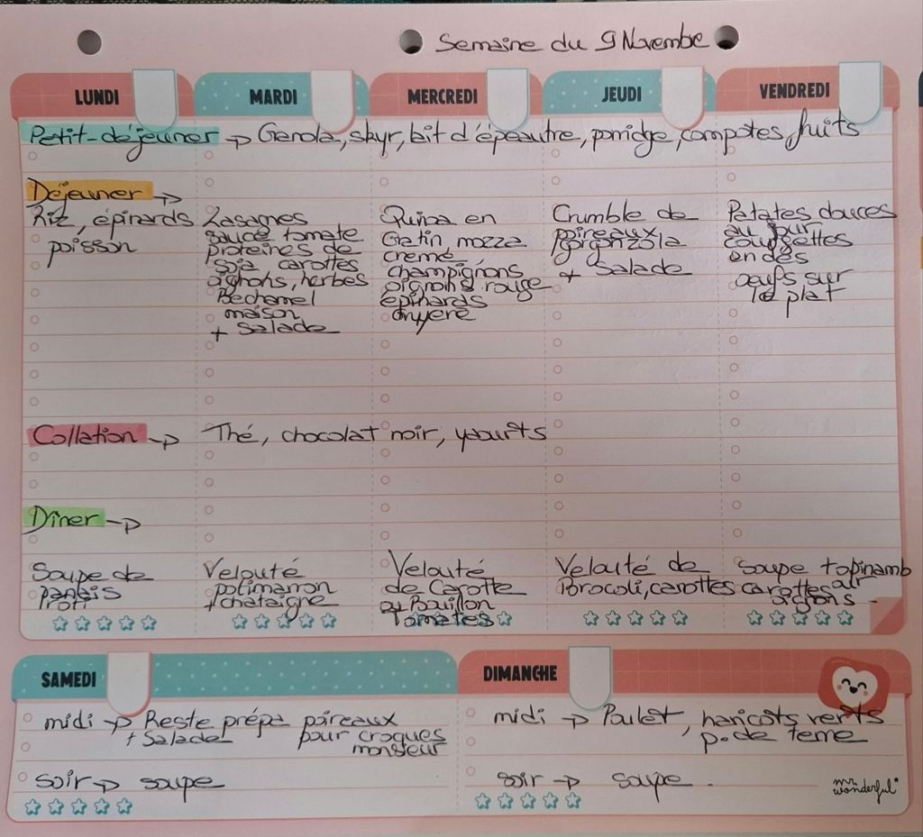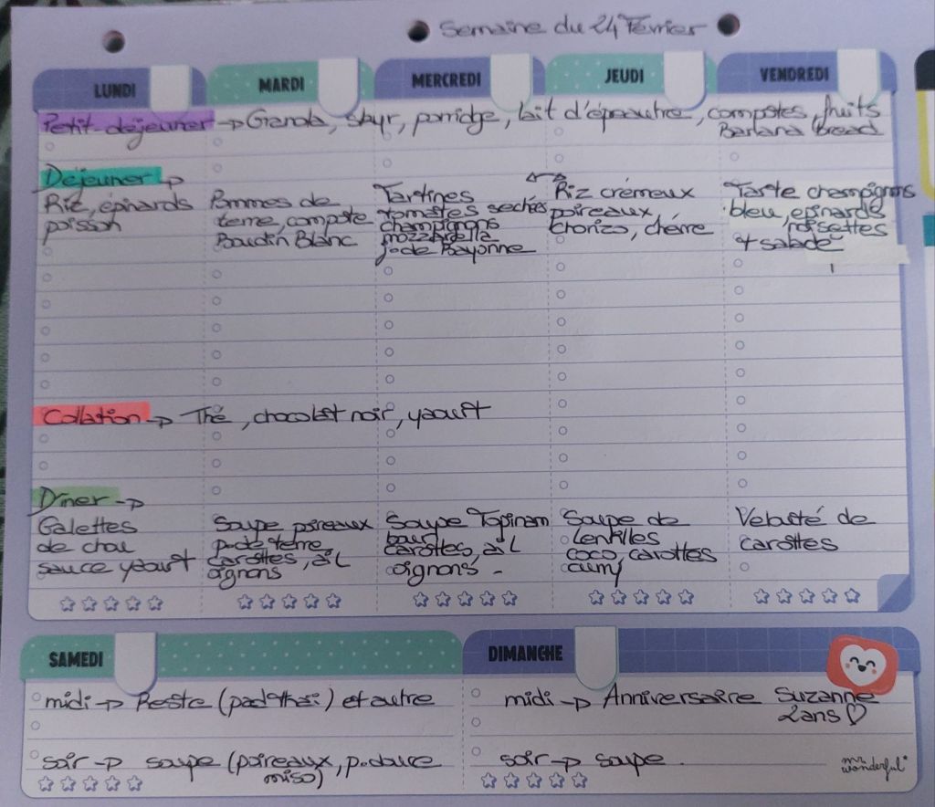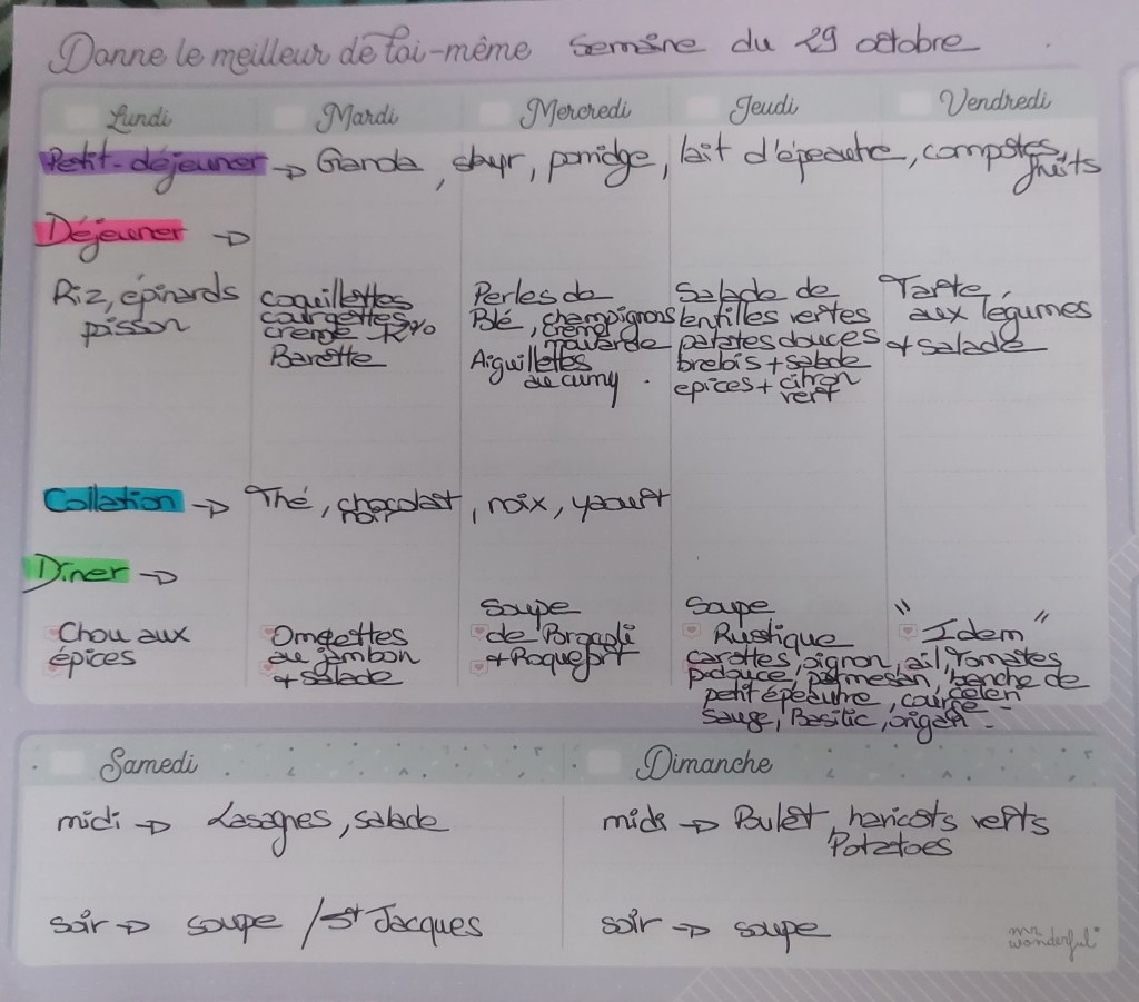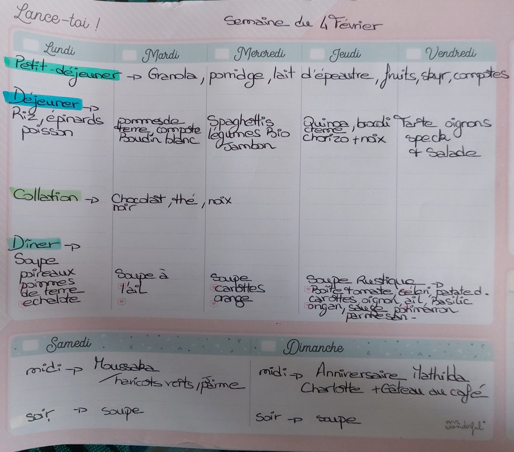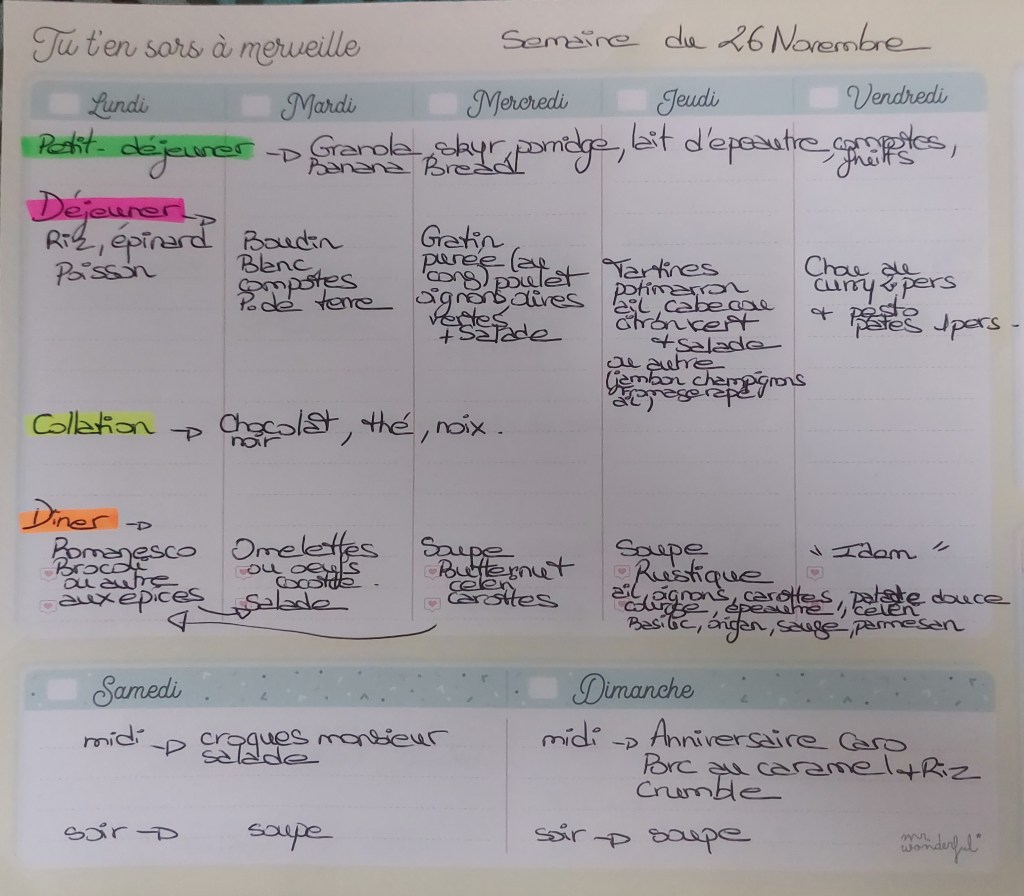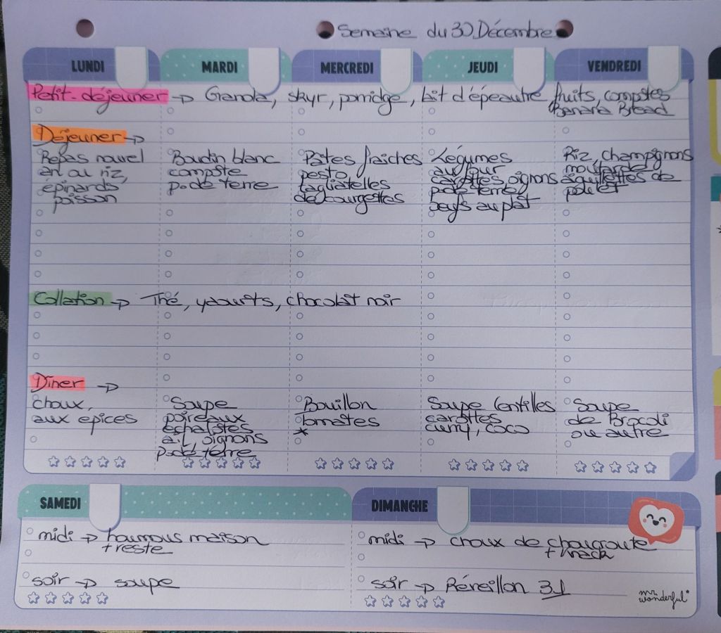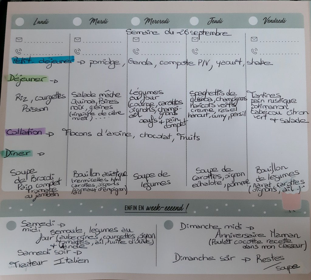 Pour créer mes menus, j’ai un semainier de la marque Mr Wonderful, il est pratique et permet de visualiser ta semaine en un clin d’œil !😉