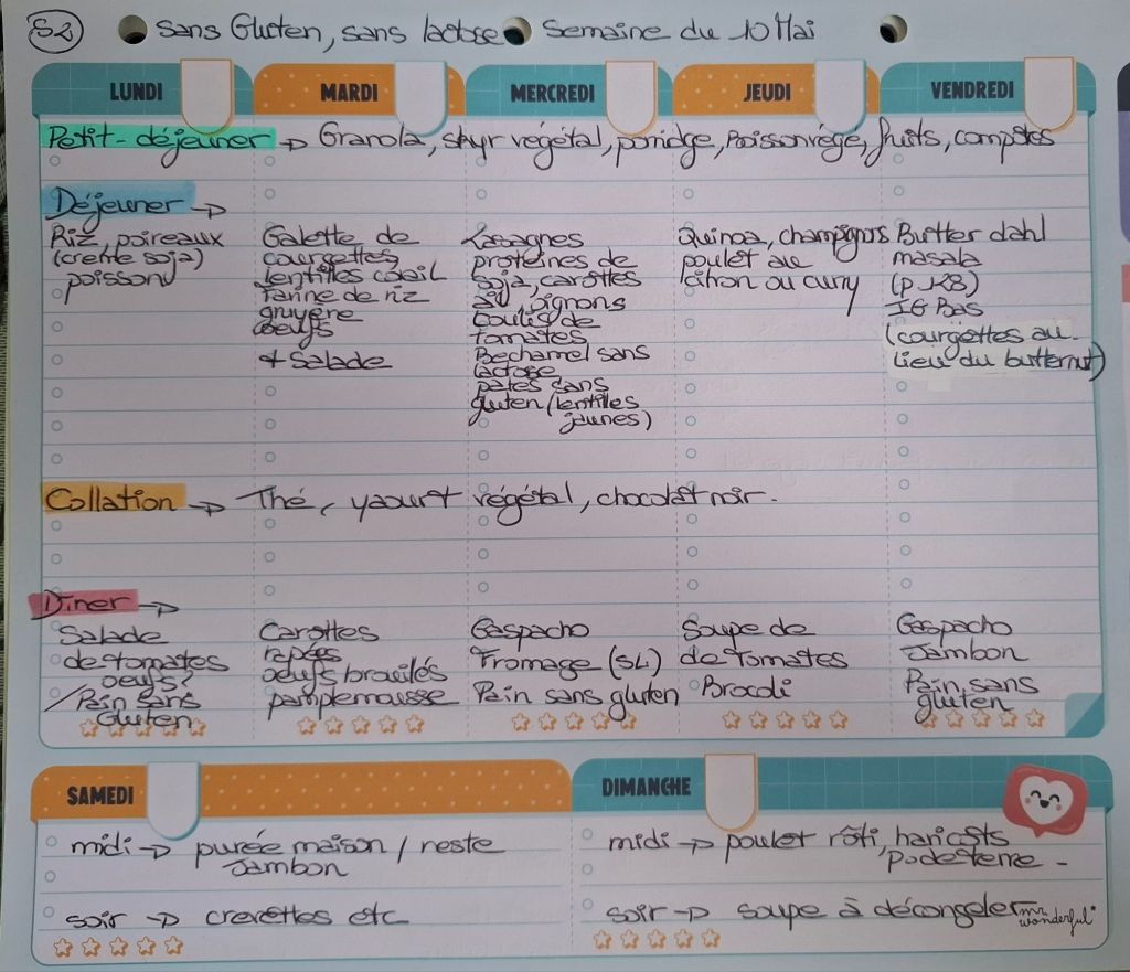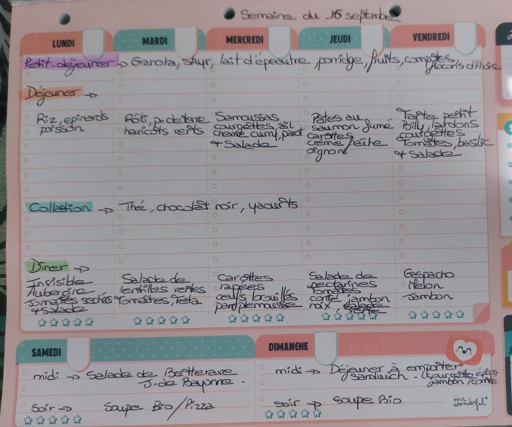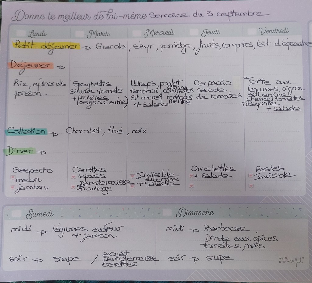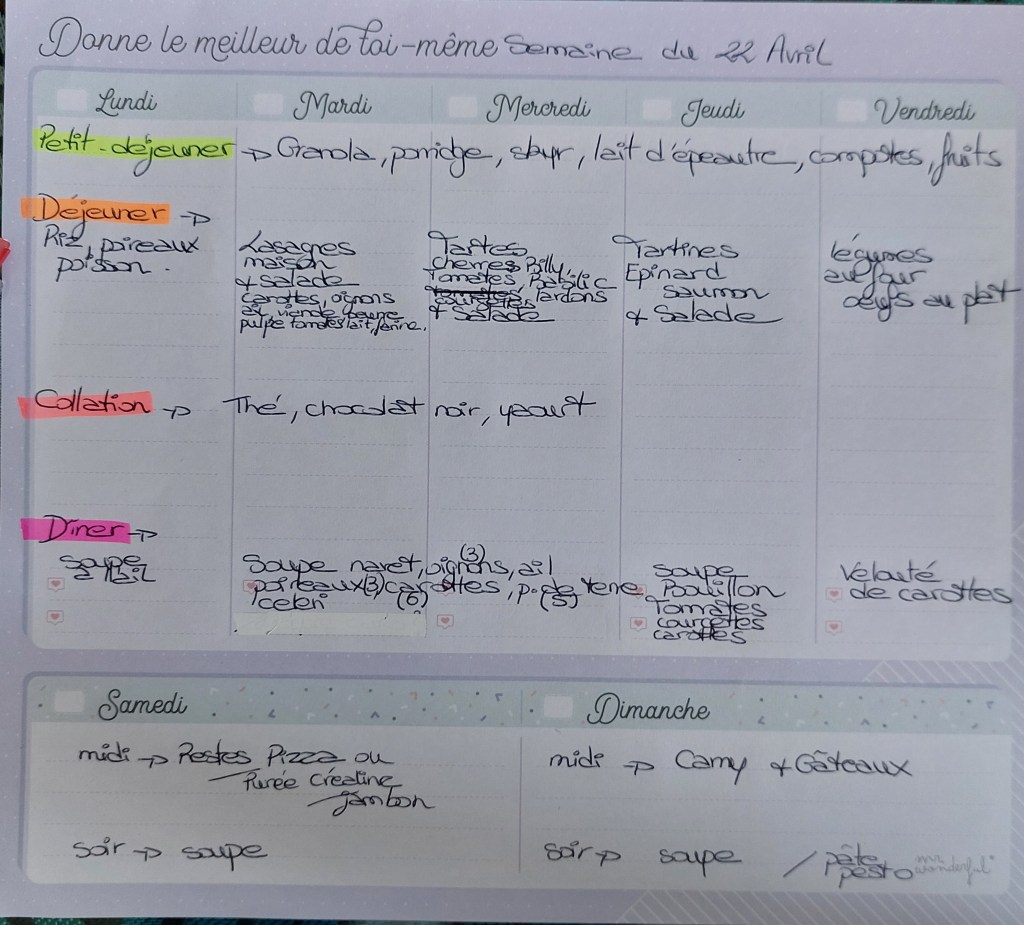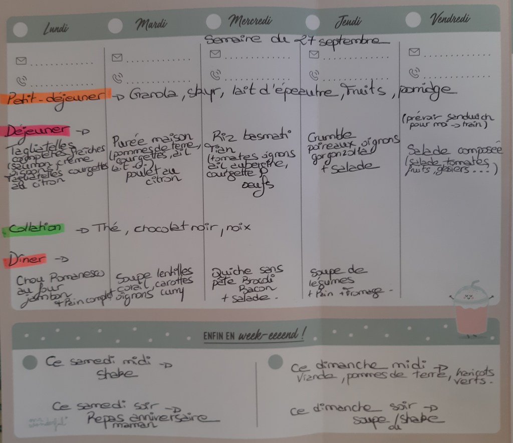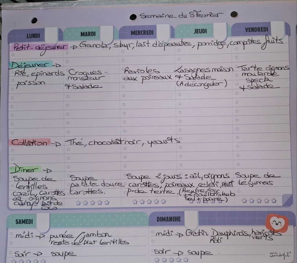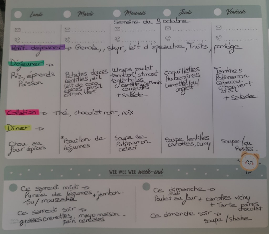 Pour créer mes menus, j’ai un semainier de la marque Mr Wonderful, il est pratique et permet de visualiser ta semaine en un clin d’œil !😉