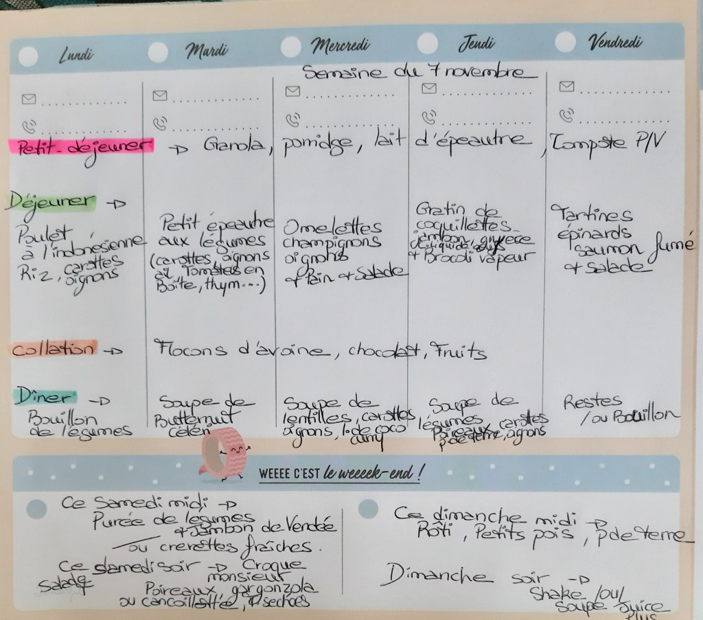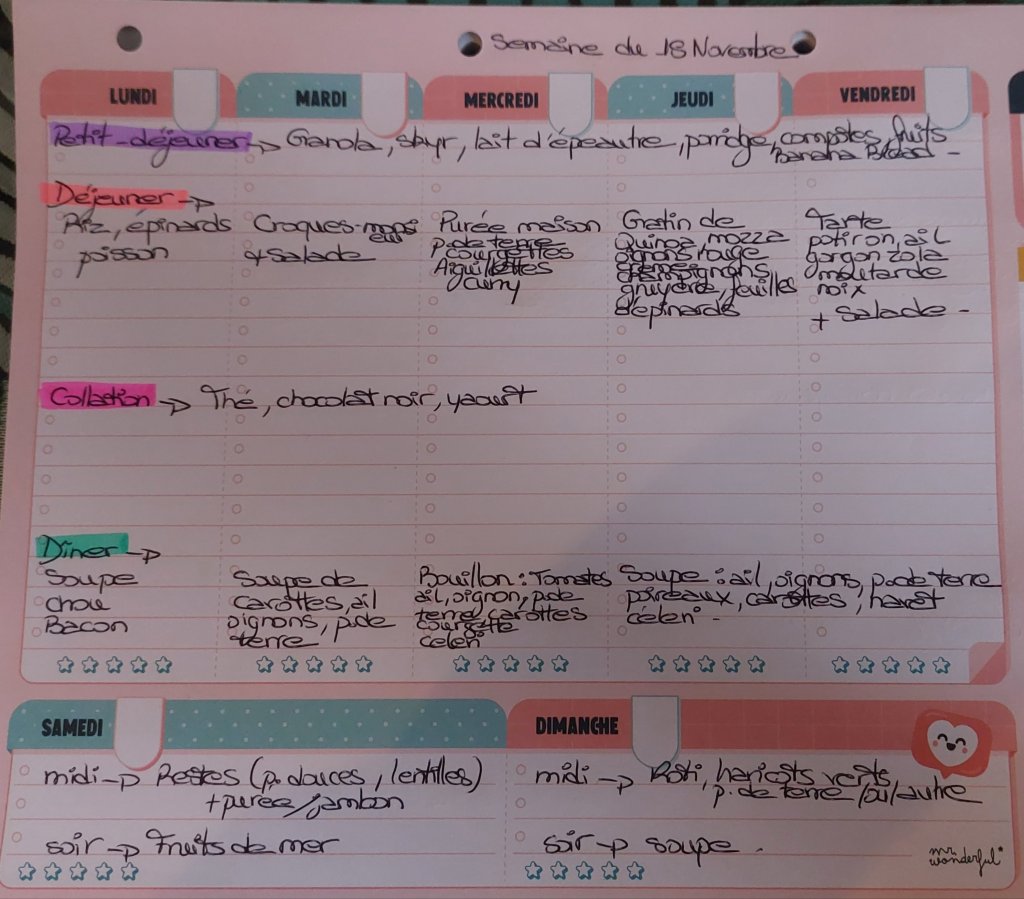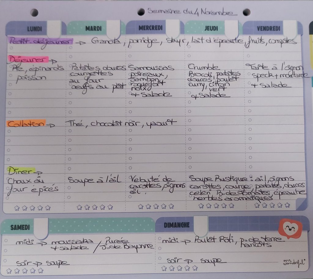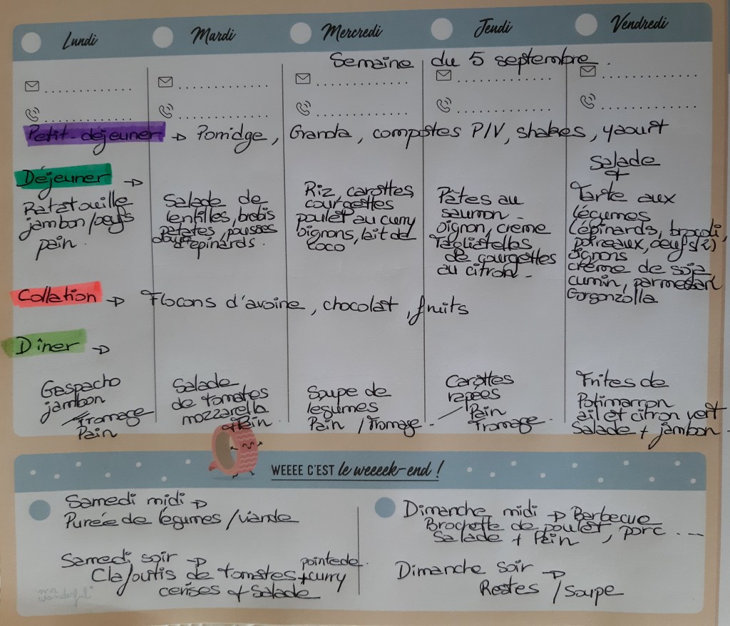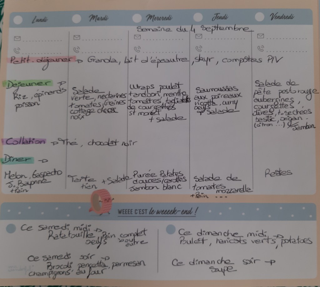ORGANISER ses menus en avance permet de savoir quoi acheter pendant ses courses, de ne pas perdre de temps devant le frigo au moment de préparer les repas, d’économiser du temps et de l’argent, d’être anti gaspi!